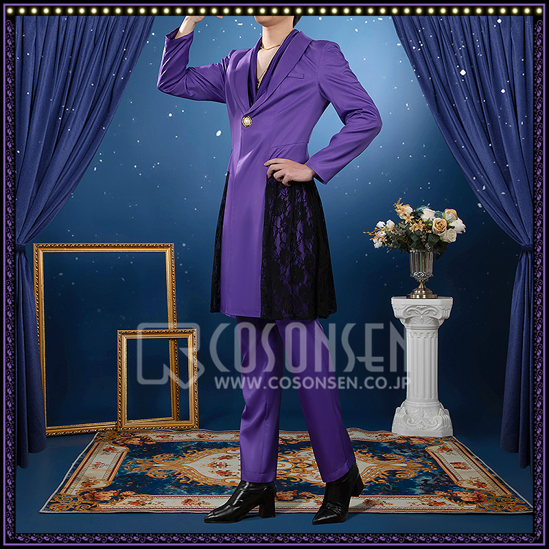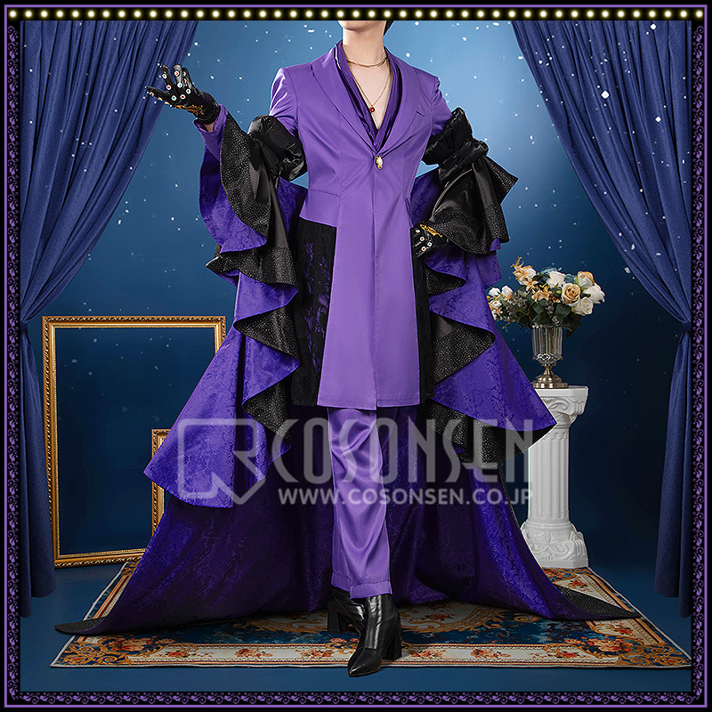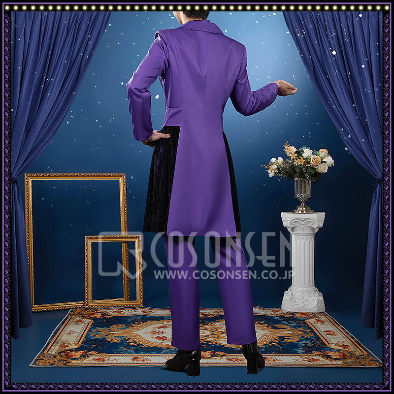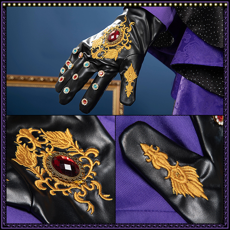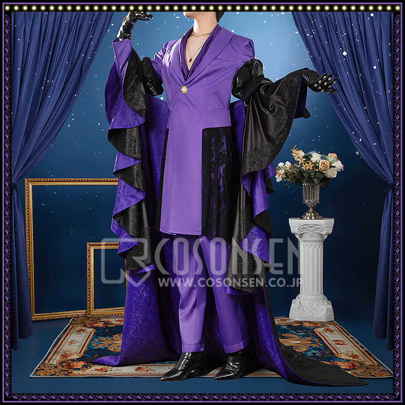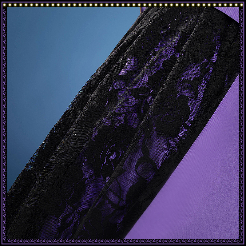 ジャガード生地、サテン、レースで製作しています。深みのある紫と黒を基調として、裾にスパンコール付きレースが縫製されていて、キラキラでエレガントでありながらも、神秘的な雰囲気を持ちます。上品な素材と丁寧な作りで、細部までしっかり再現された。