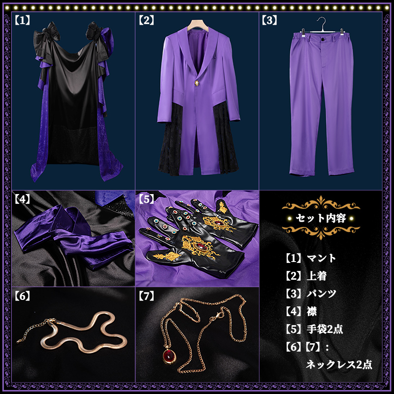 マント、上着、パンツ、飾り物(襟、ネックレス2点、手袋2点)