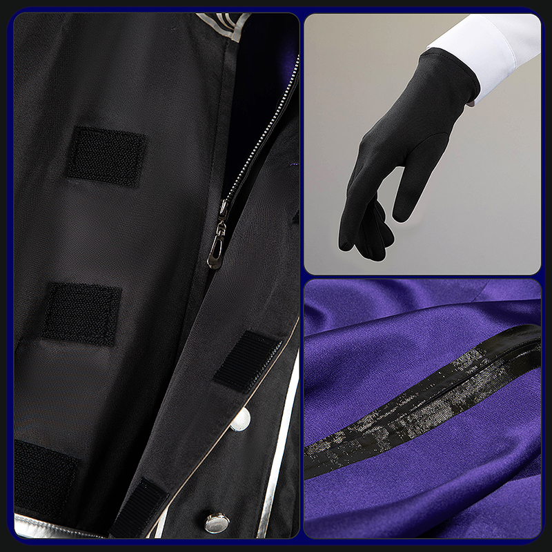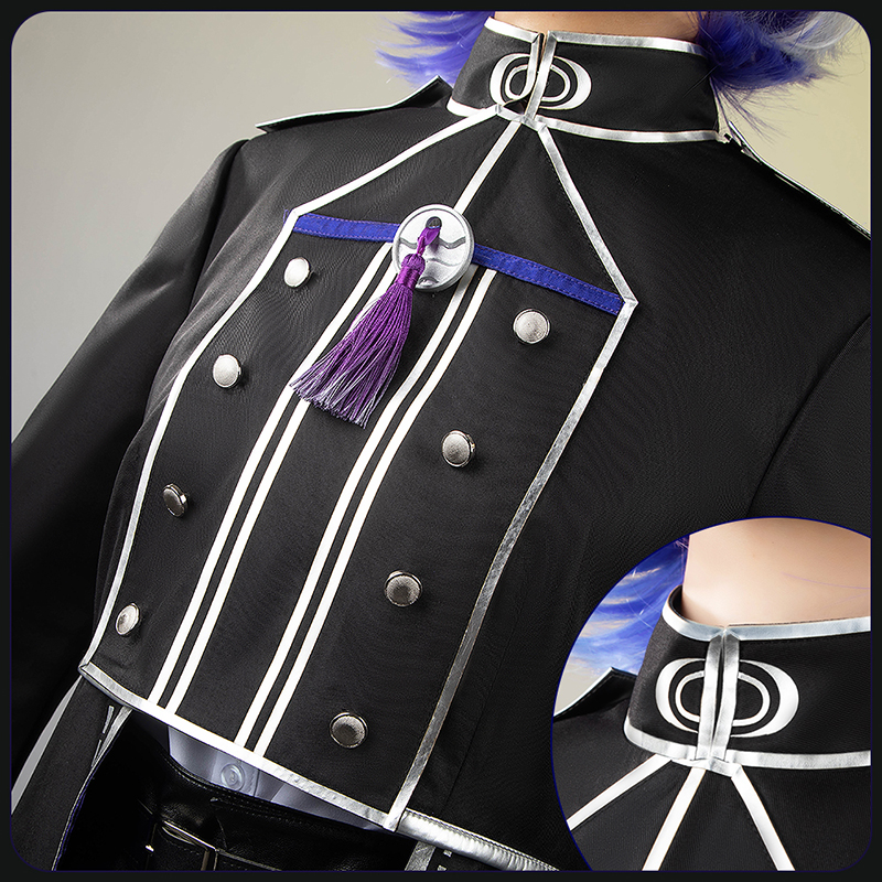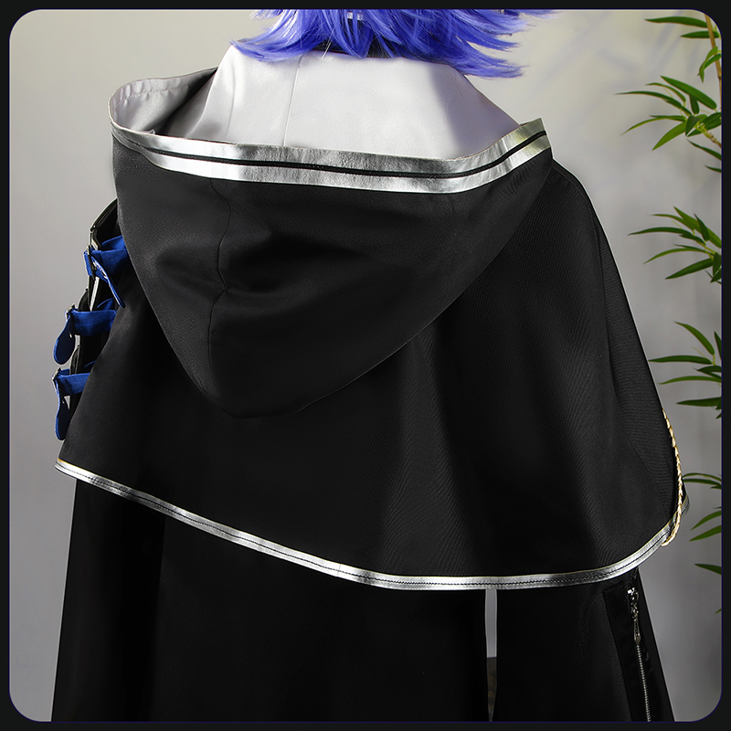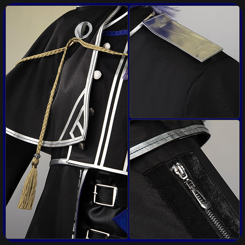 ポリエステルギャバとサテンで製作しています。黒を基調としたコートで、原作に忠実して銀色の縁取りが付いて綺麗に見えます。