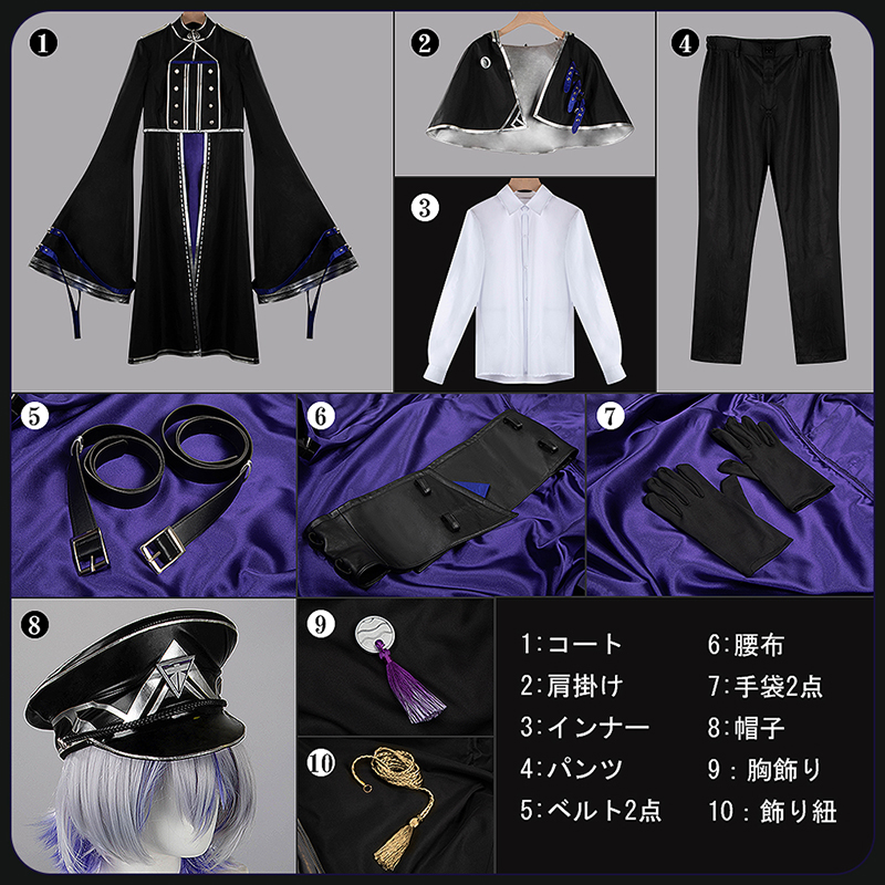 コート、肩掛け、インナー、パンツ、帽子、飾り物(飾り紐、胸飾り、手袋2点、腰布、ベルト2点)