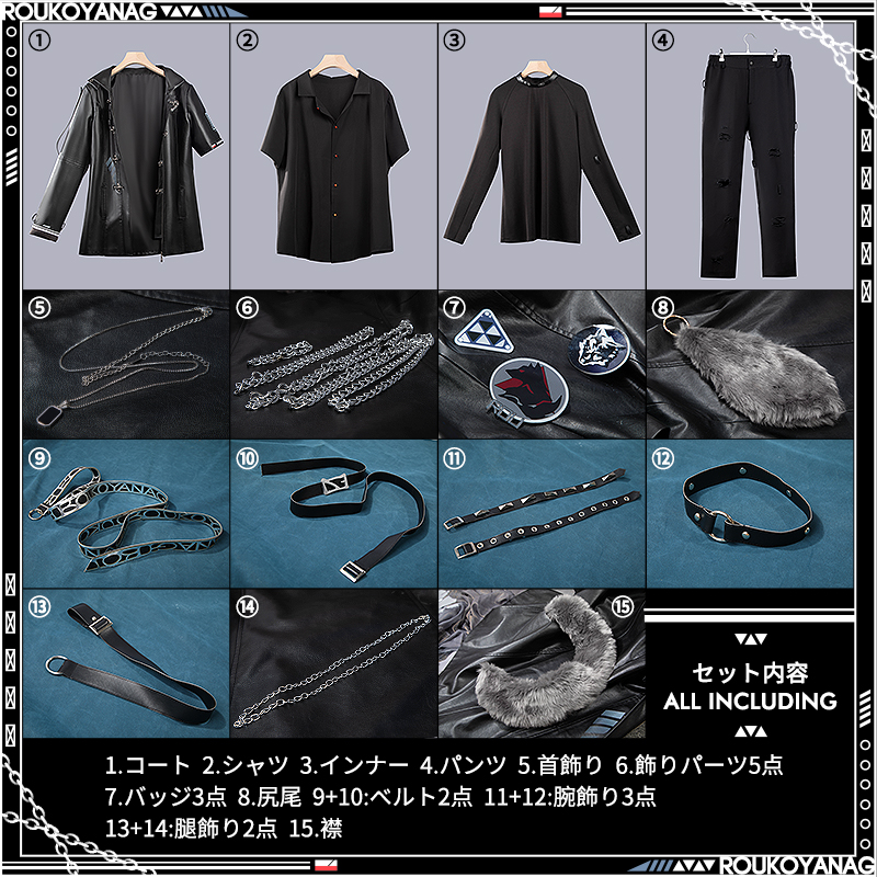 コート、シャツ、インナー、パンツ、飾り物(首飾り、襟、腕飾り3点、バッジ3点、飾りパーツ5点、ベルト2点、腿飾り2点、尻尾)