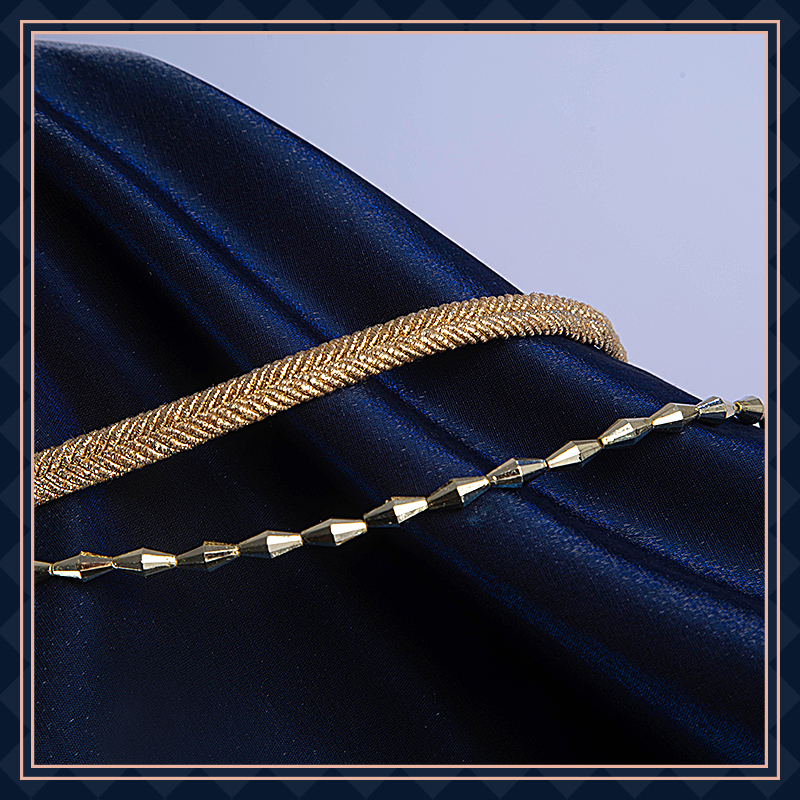 光沢布で製作しています。光沢感のある素材を使って、正面に金色のラインが施されています。