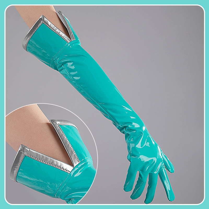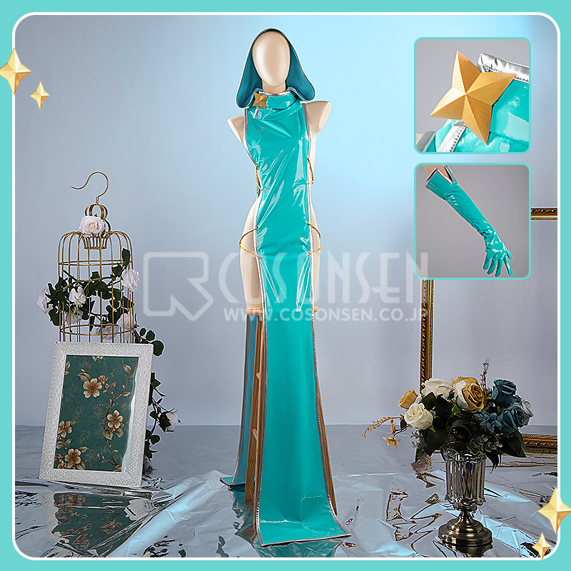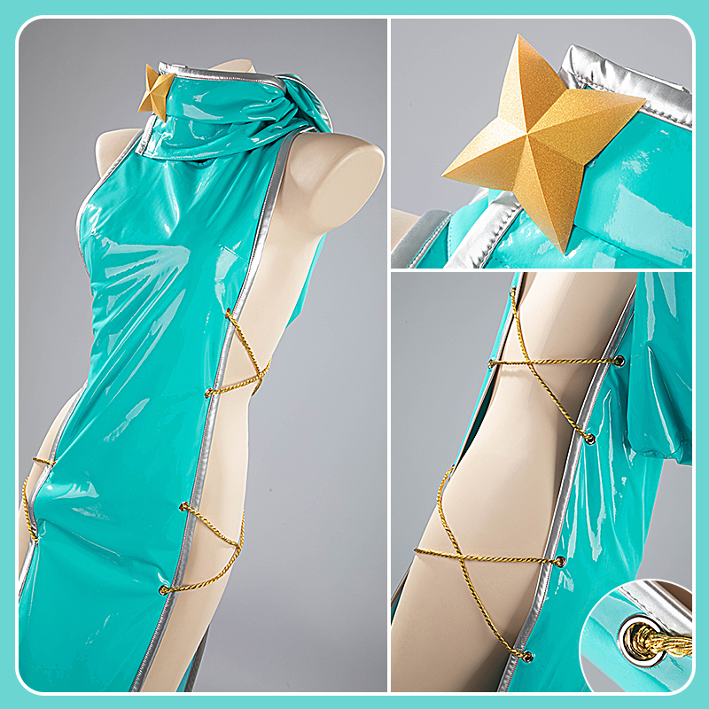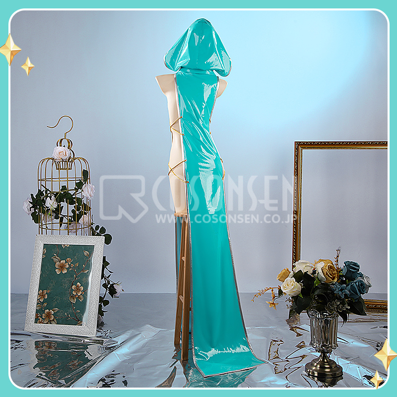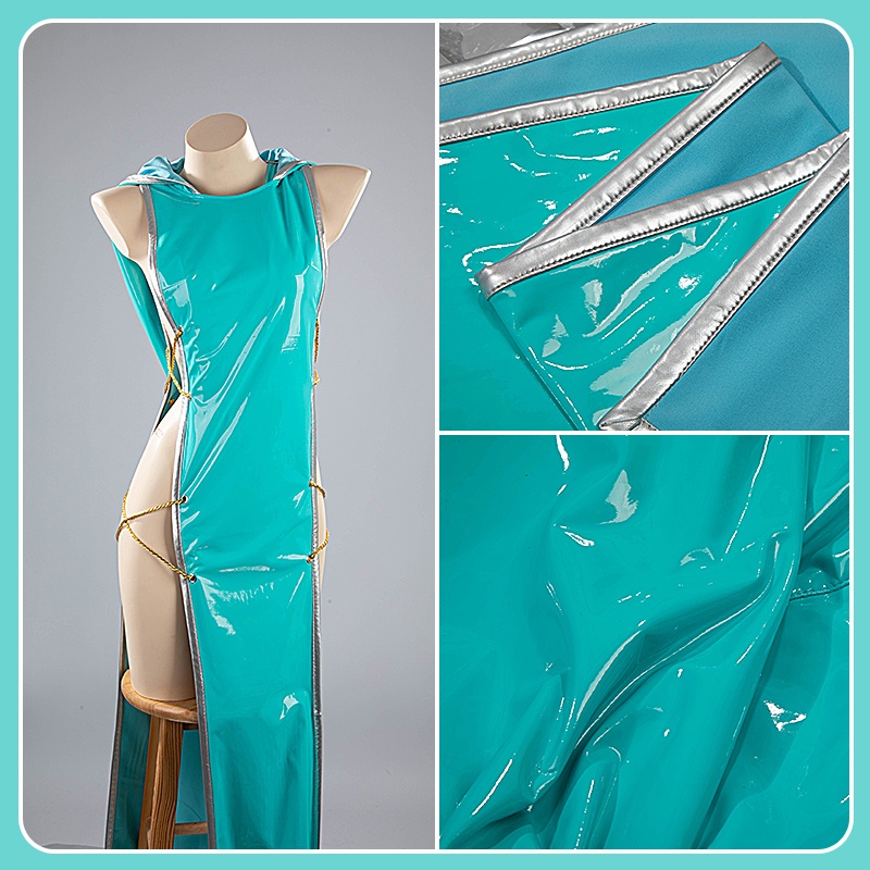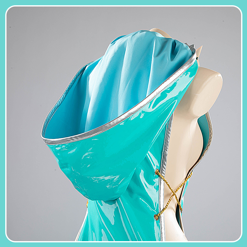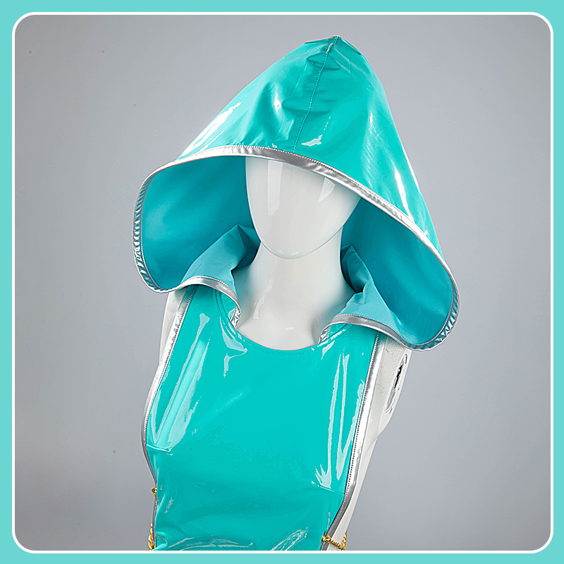 合皮で製作しています。フード付きのワンピースです。ティファニー ブルーを使って、綺麗なウェストラインは印象的です。
