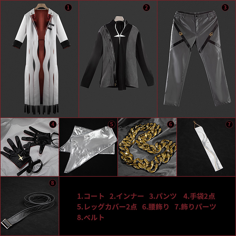 コート、インナー、パンツ、飾り物(手袋2点、飾りパーツ、ベルト、腰飾り、レッグカバー2点)