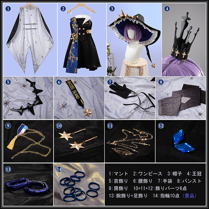 マント、ワンピース 飾り物(帽子、王冠、首飾り、手袋、腕飾り、腰飾り、房飾り、パンスト、足飾り、飾りパーツ3点)