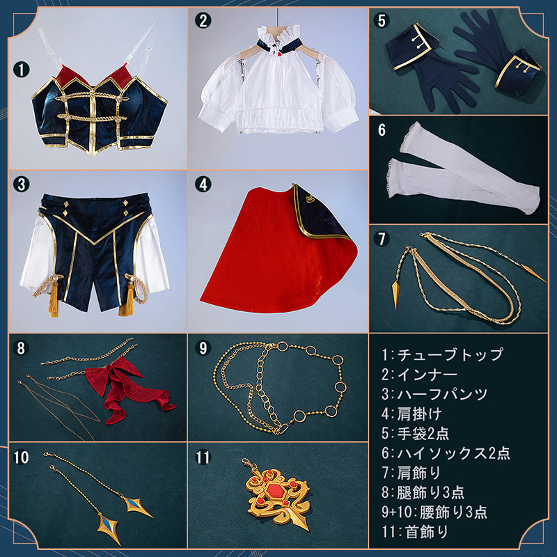 肩掛け、インナー、チューブトップ、ハーフパンツ、飾り物(首飾り、肩飾り、手袋2点、腰飾り3点、腿飾り3点、ハイソックス2点)