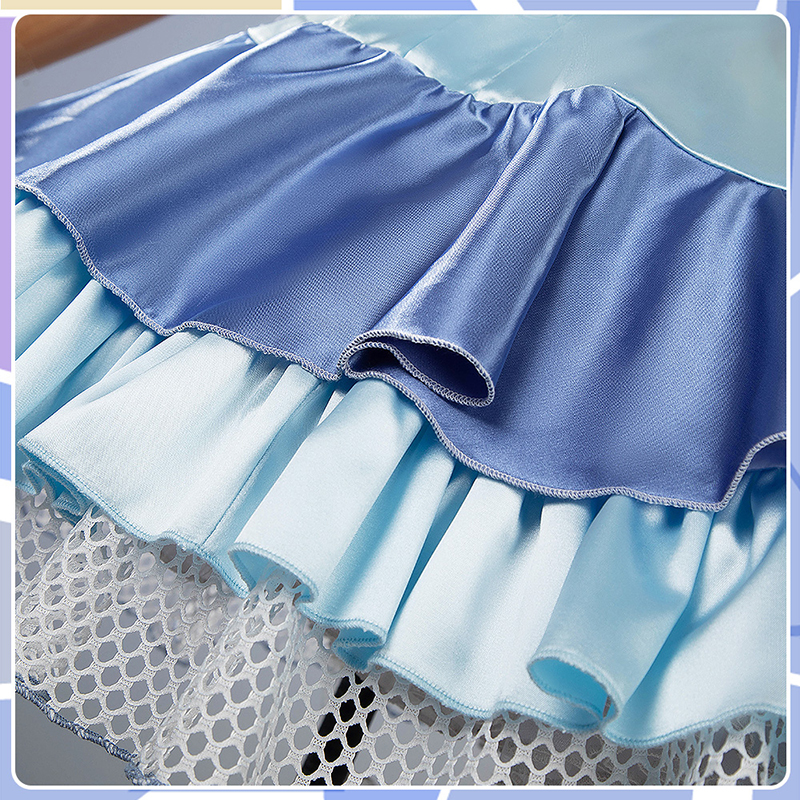 サテンで製作しています。明るい色合いが目を引き、裾の部分は多重プリーツでふわふわ可愛いです。