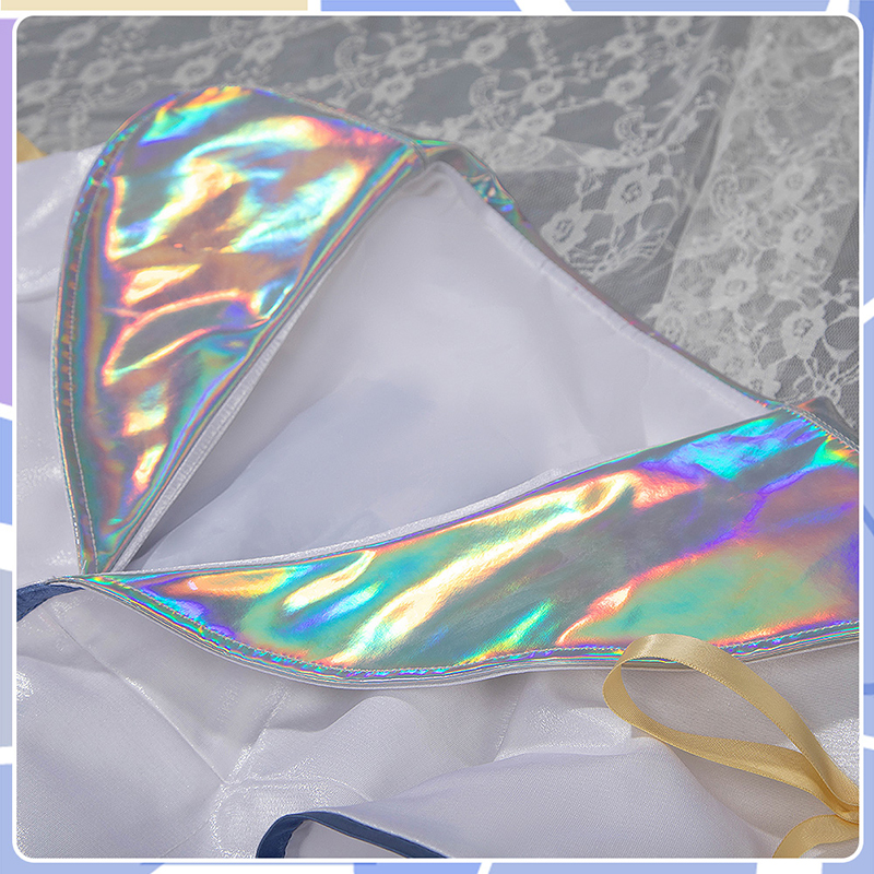 光沢布とレーザー皮で製作しています。白を基調として、水色の縁取りが施されて元気で活発な印象を与えます。