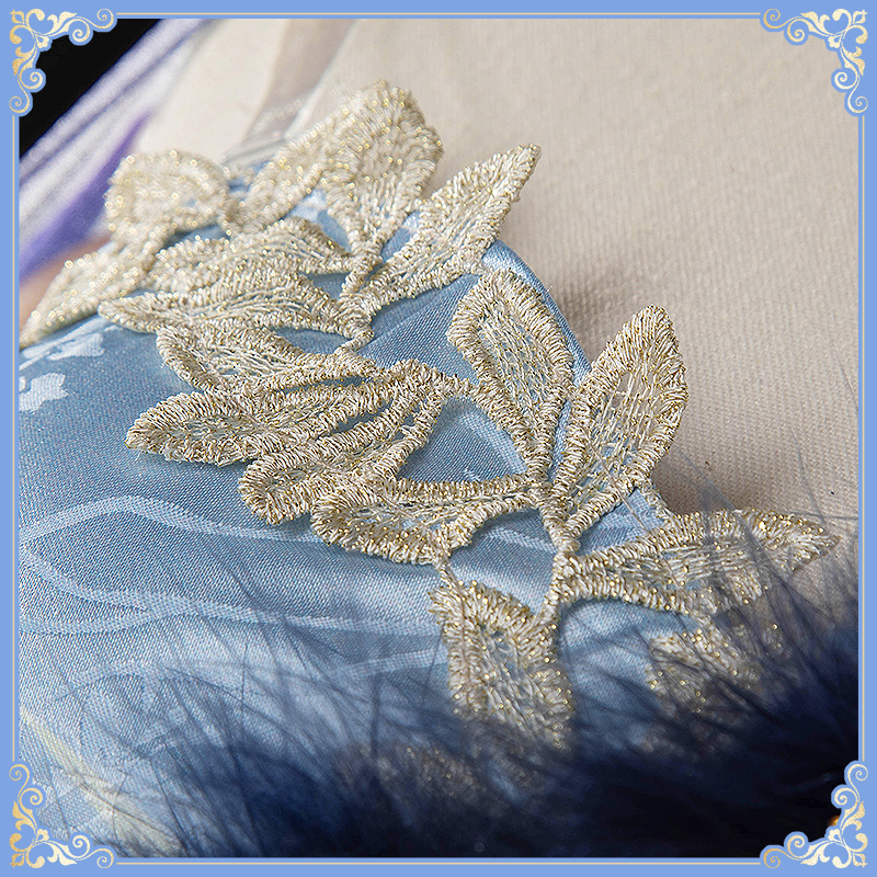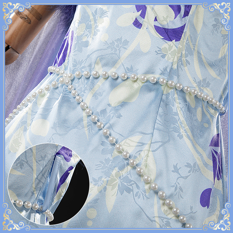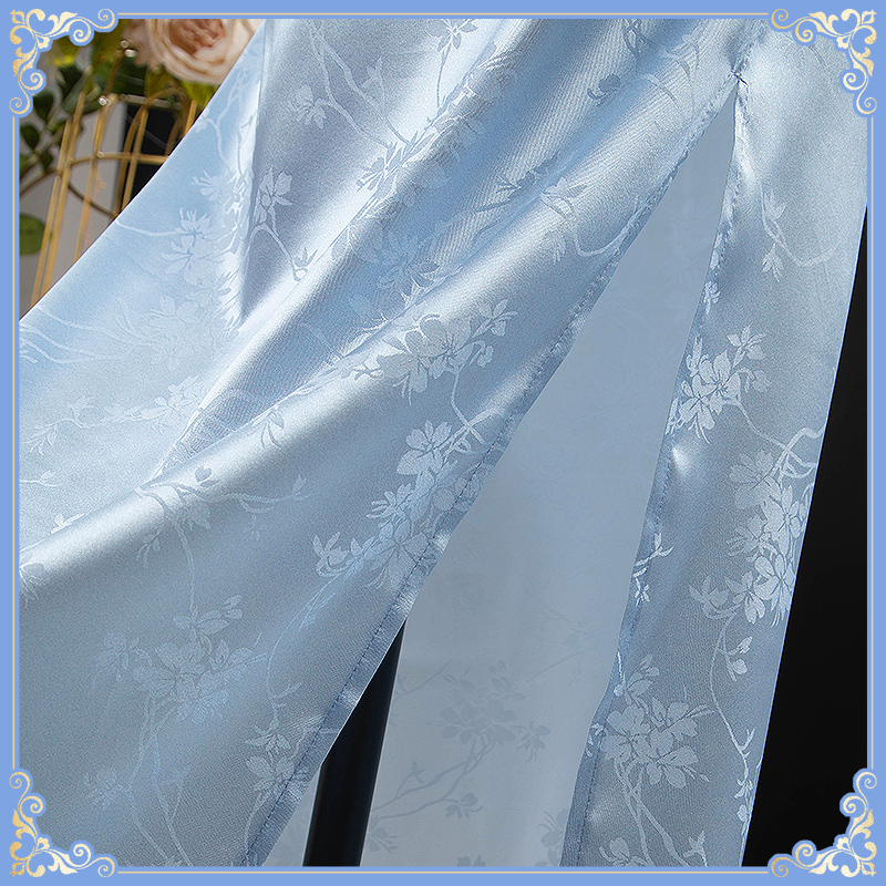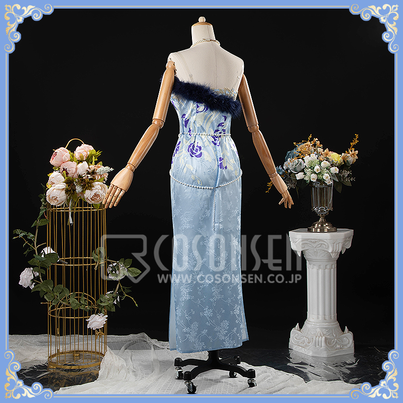 ジャガード生地で製作しています。紺碧を基調とした華やかなワンピースで、、美しいバラの花柄が全体にプリントされています。金色のディテールや繊細なフリルが施され、動くたびに優雅に揺れるその姿は、まるで舞い踊る花のようです。