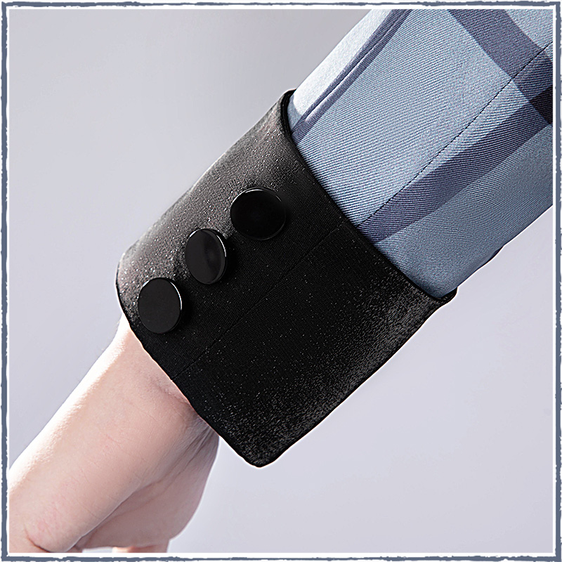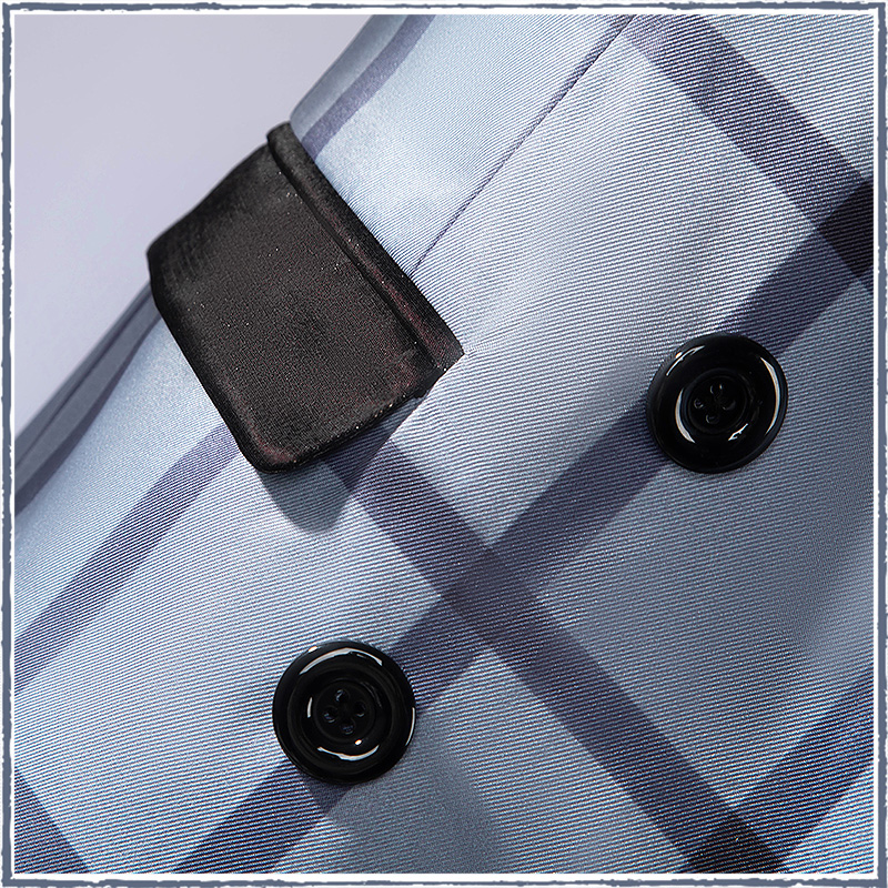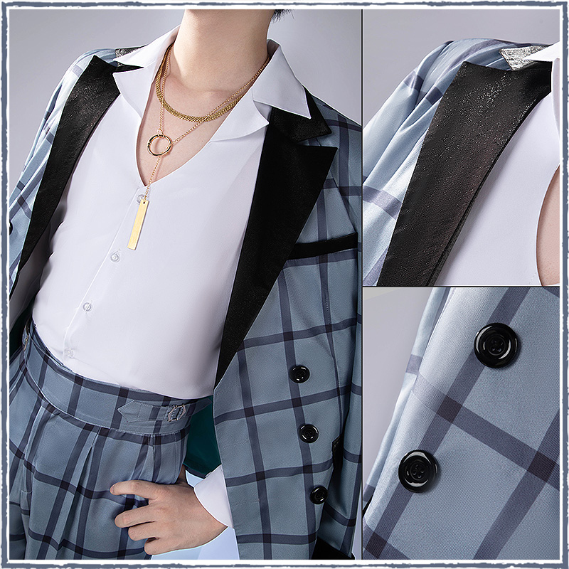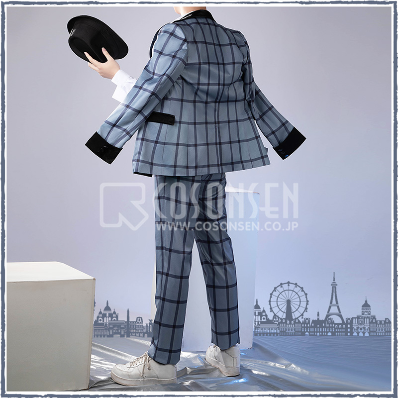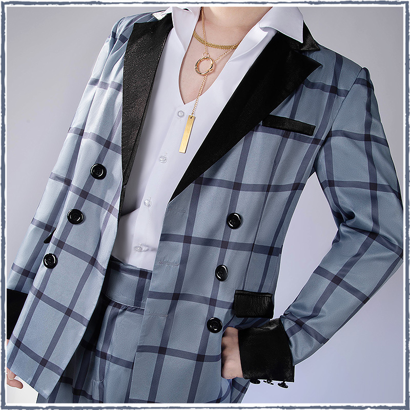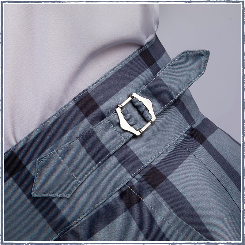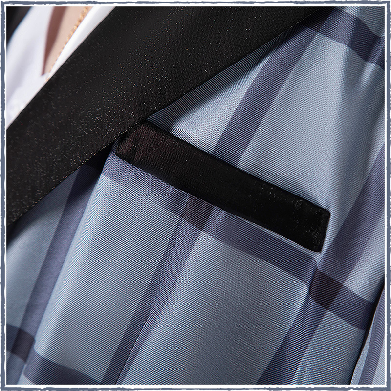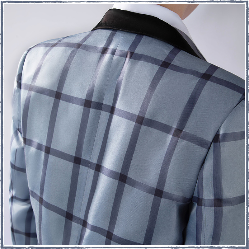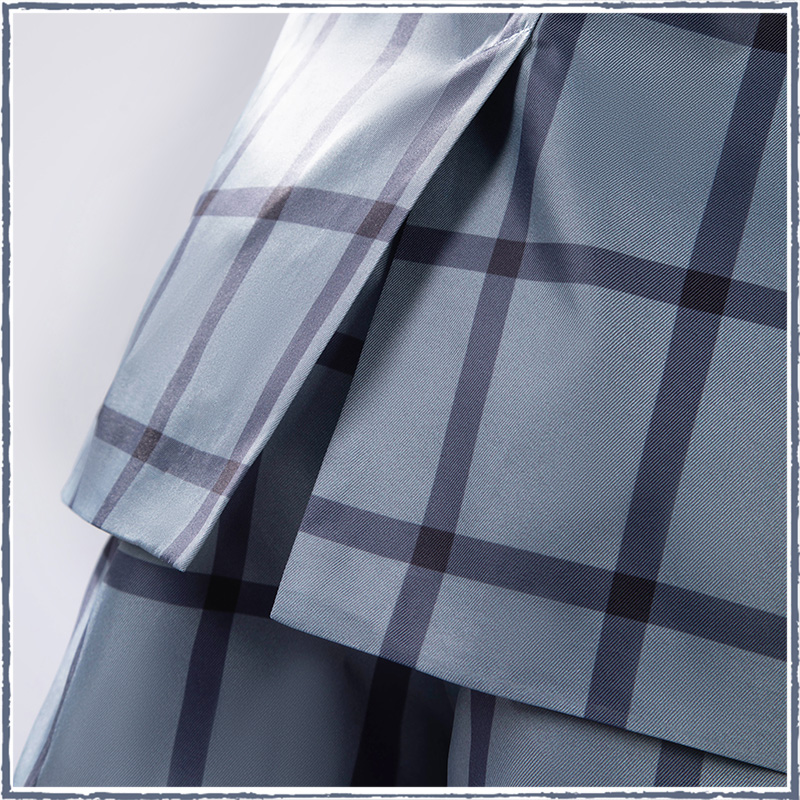 ポリエステルギャバで製作しています。エレガントなスーツで、格子縞がプリントされて再現度が高いです。