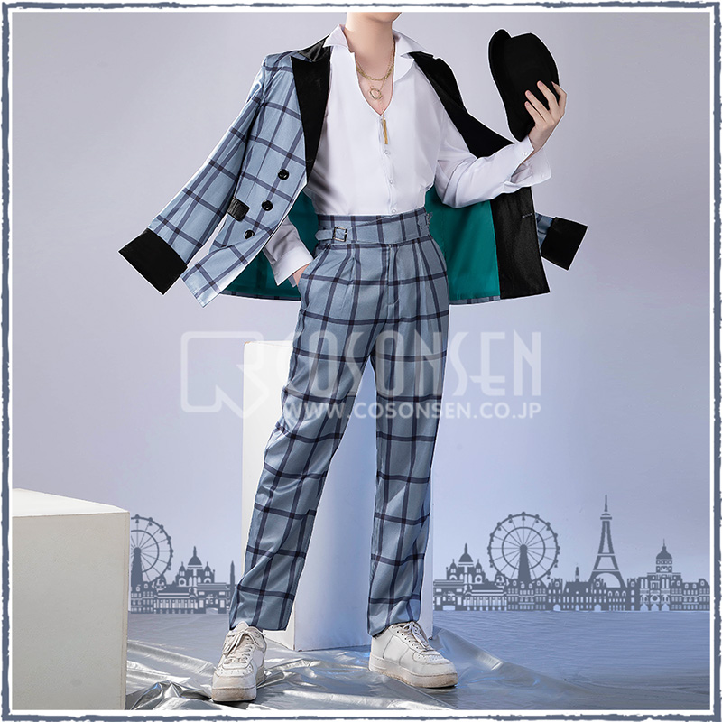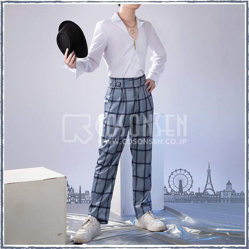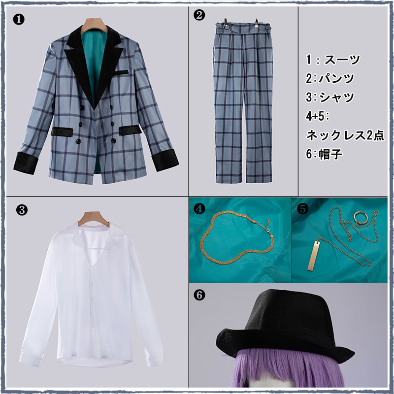 スーツ、シャツ、パンツ、飾り物(帽子、ネックレス2点)