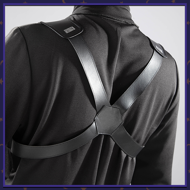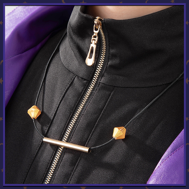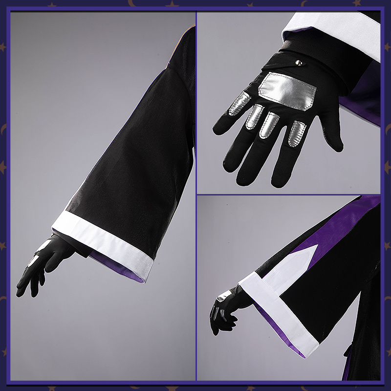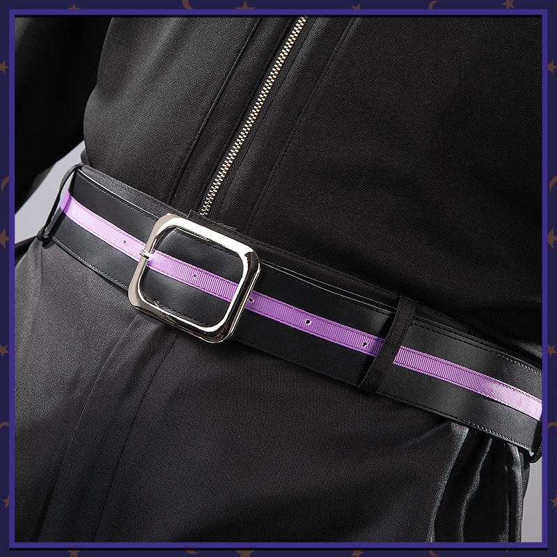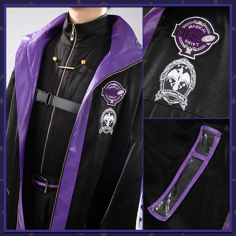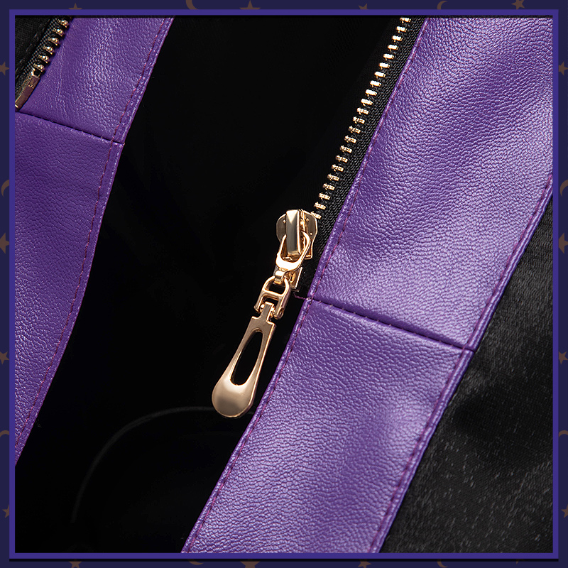 光沢布とレザーで制作しています。紫と黒を基調として、胸に原作の絵柄を貼り付けて再現度が高いです。