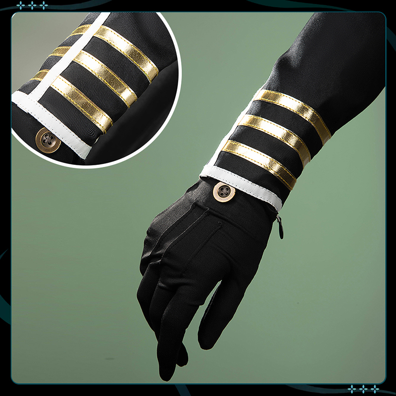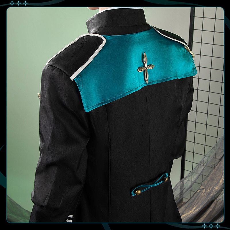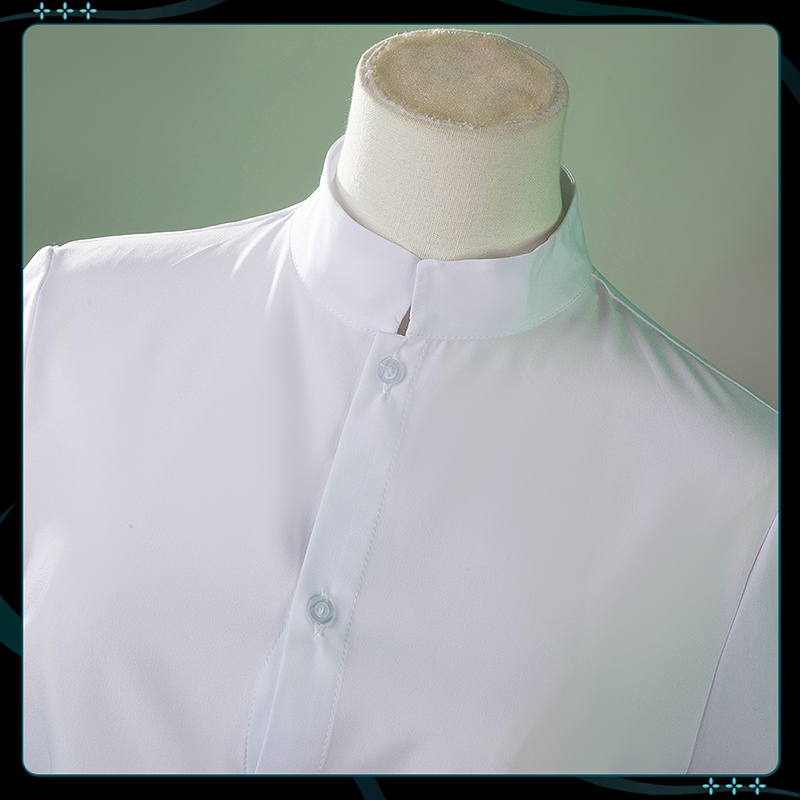 ポリエステルギャバで製作しています。金色のボタンと襟の金色の十字柄が特徴で、このディテールは忠実に再現されています。重ね着しやすく、スタイリングの幅も広がります。シンプルながら華やかさを持ち、さまざまなコーディネートに活用できます。