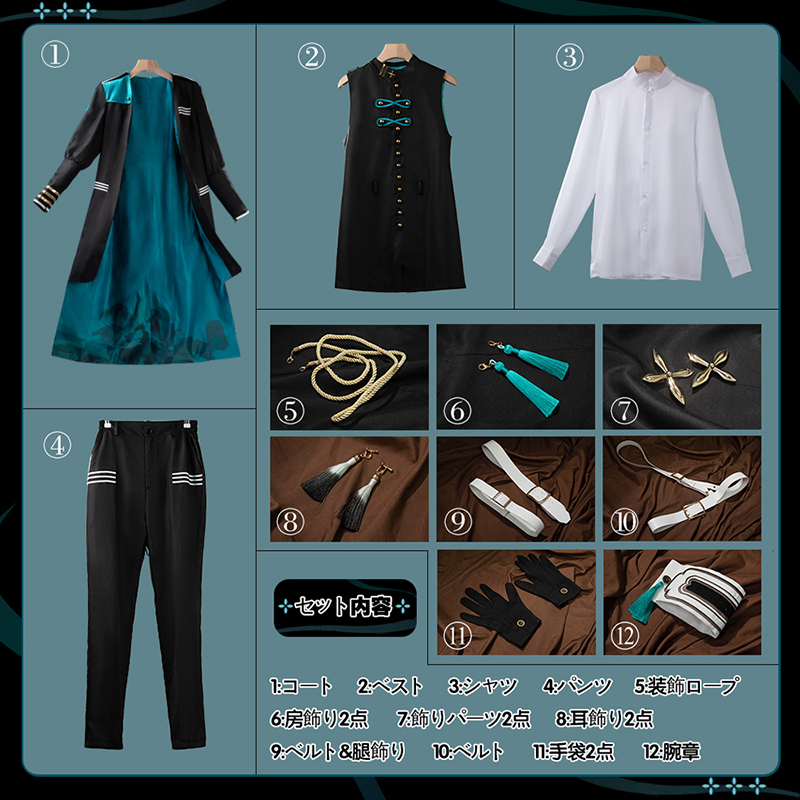 コート、ベスト、シャツ、パンツ、飾り物(耳飾り2点、腕章、手袋2点、房飾り2点、飾りパーツ2点、ベルト2点、腿飾り、装飾ロープ)
