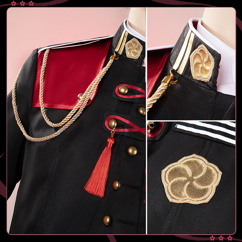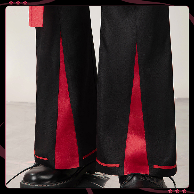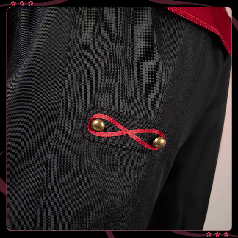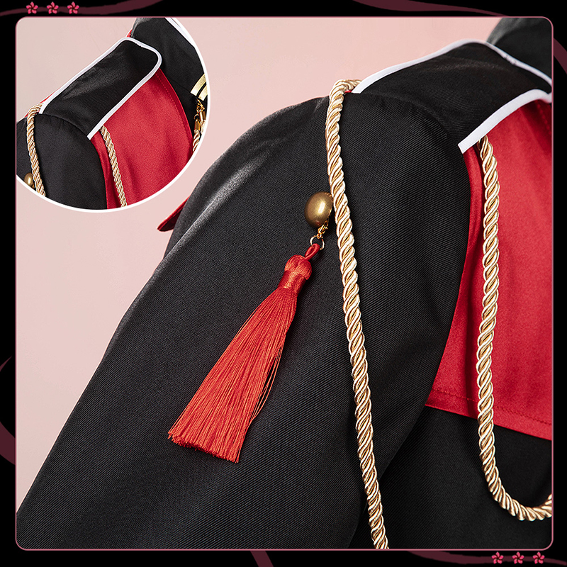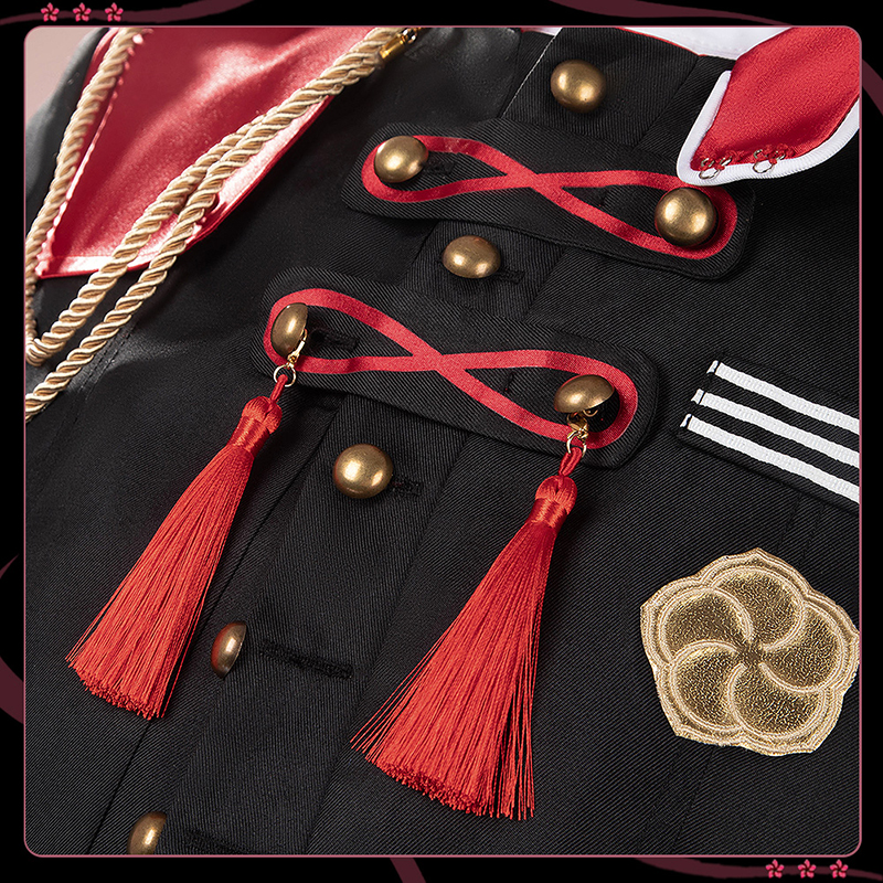 ポリエステルギャバで製作しています。赤のアクセントと金色の飾りが全体を引き締め、高級感と洗練された印象を与えています。