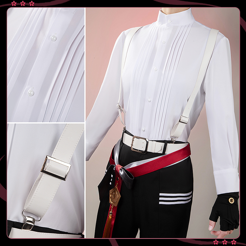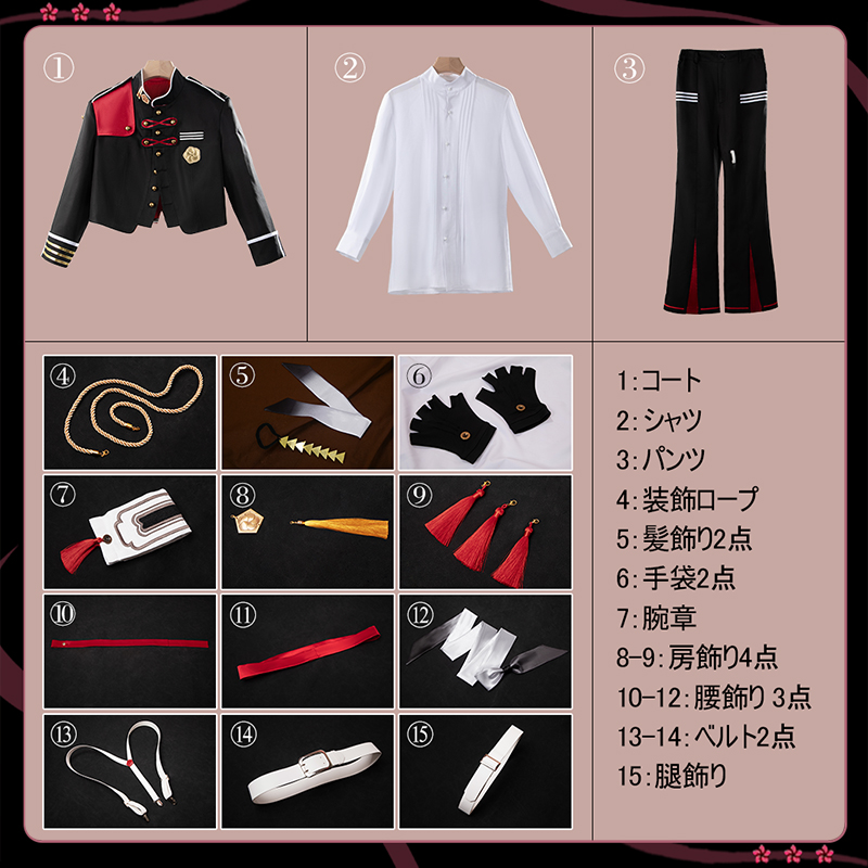 コート、シャツ、パンツ、飾り物(髪飾り2点、装飾ロープ、腕章、房飾り4点、ベルト2点、腰飾り3点、手袋2点、腿飾り)