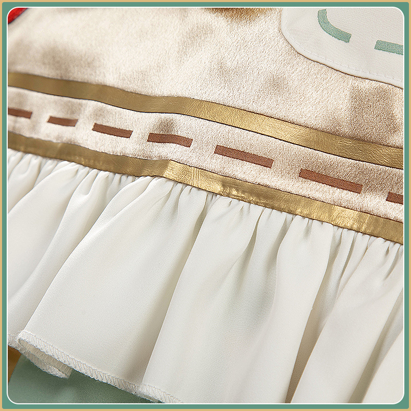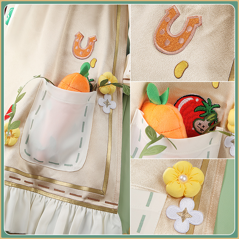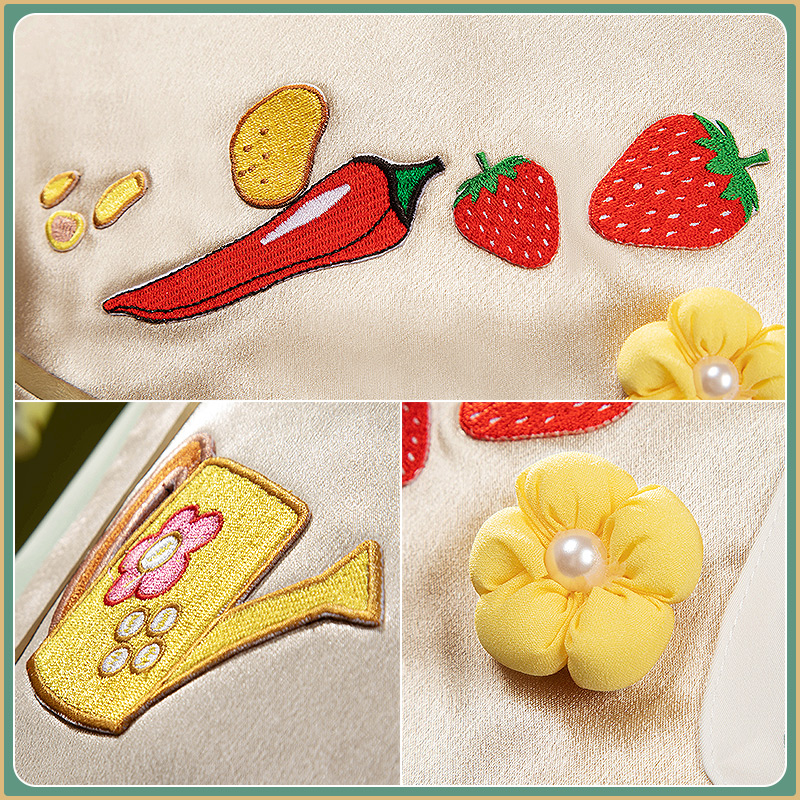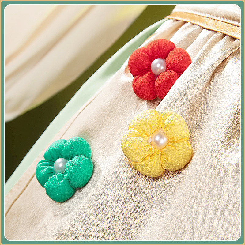 紋紗で製作しています。温かみのある米色に愛らしい柄がデザインされ、裾にはフリルがあります。実用的な小さなポケットが付いており、アイテムを収納するのも便利です。