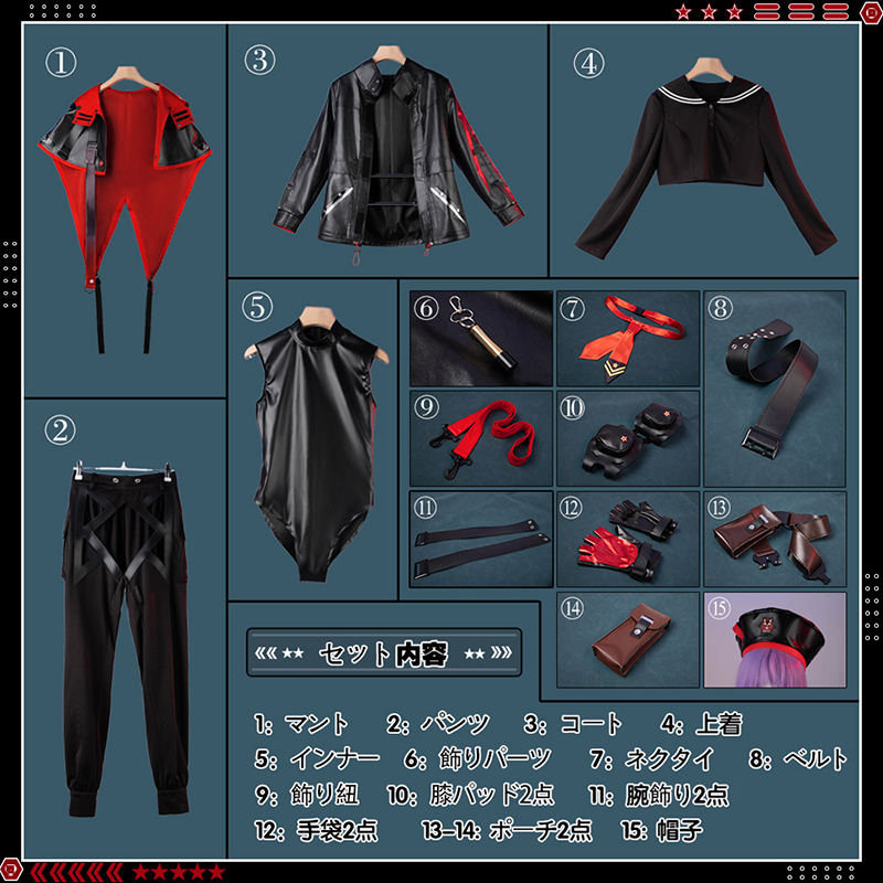 帽子、マント、コート、インナー、パンツ、飾り物(ネクタイ、ベルト、腕飾り、手袋2点、飾り紐、膝パッド2点、ポーチ2点)