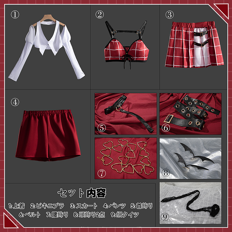 上着、ビキニブラ、パンツ、スカート、飾り物(首飾り、頭飾り2点、ベルト、腰飾り、網タイツ)
