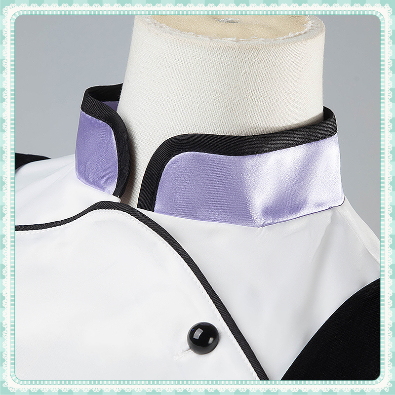 ダッチェスで製作しています。紫の袖と襟が際立つこの上着は、白の清潔感を基調に、黒のラインがシャープなアクセントを加えます。