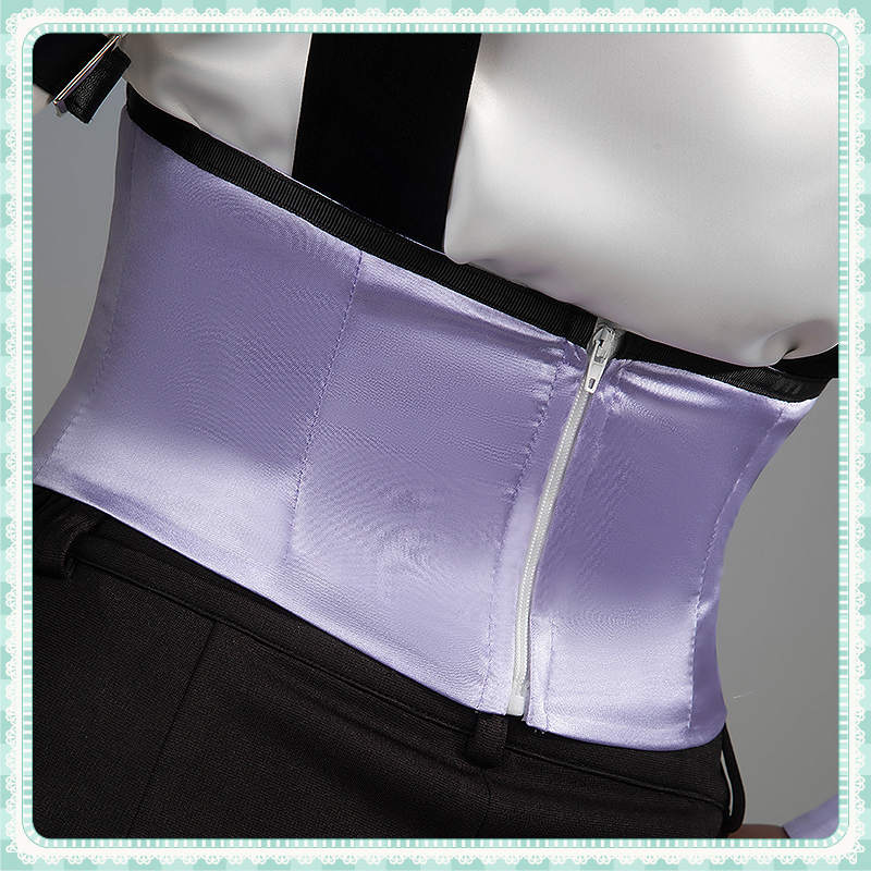 サテンで製作しています。光沢のある紫と力強い黒ストラップがエレガントに調和し、中央の白と黒のボタンがモダンなアクセントを添えます。