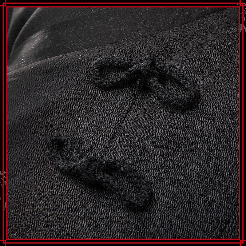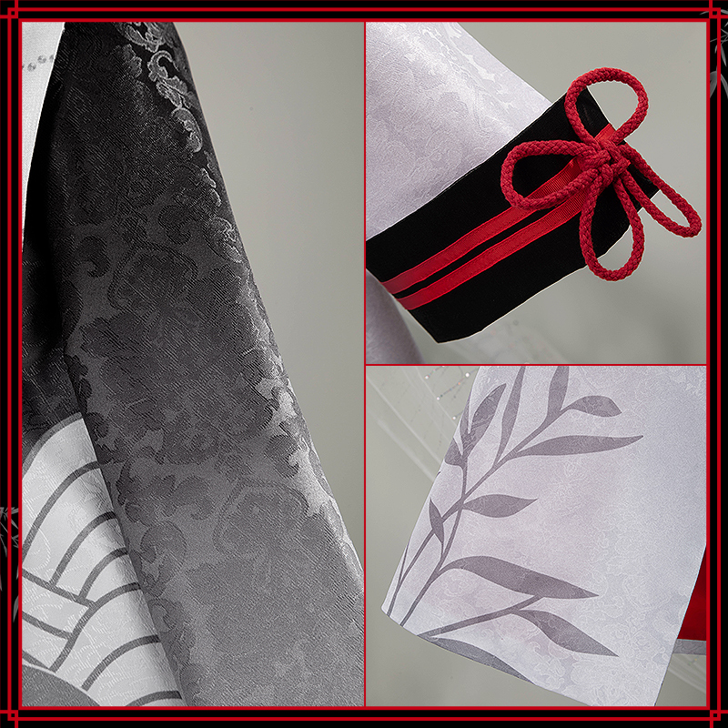 ジャガード生地で製作しています。白い波模様が施され、袖口に赤のラインが入っています。モダンなデザインと伝統的な要素が見事に融合し、エレガントなスタイルを形成しています。