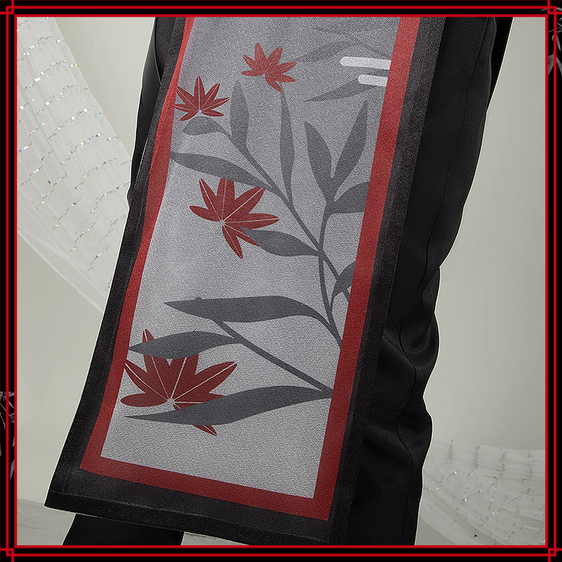 綿麻生地で製作しています。黒いベストに赤の裏地が施され、三日月の飾りが特徴で、グラデーションの裾には紅葉と雲の模様があしらわれています。