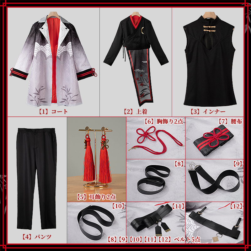 コート、上着、インナー、パンツ、飾り物(耳飾り2点、胸飾り2点、腰布、ベルト5点)