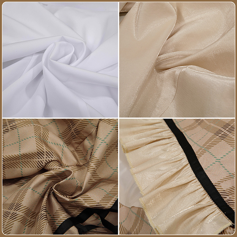 ポリエステルギャバで製作しています。女性らしいフリルを裾にたっぷりと使用し、とてもかわいくおしゃれに仕上がっているのです。