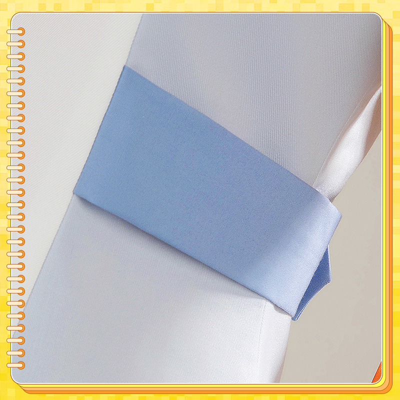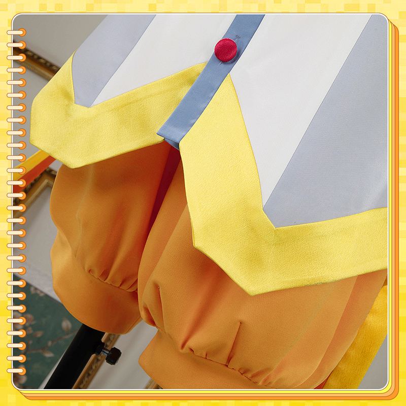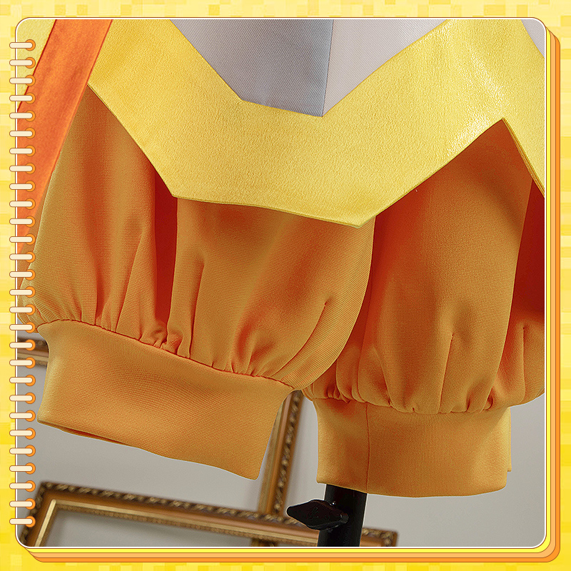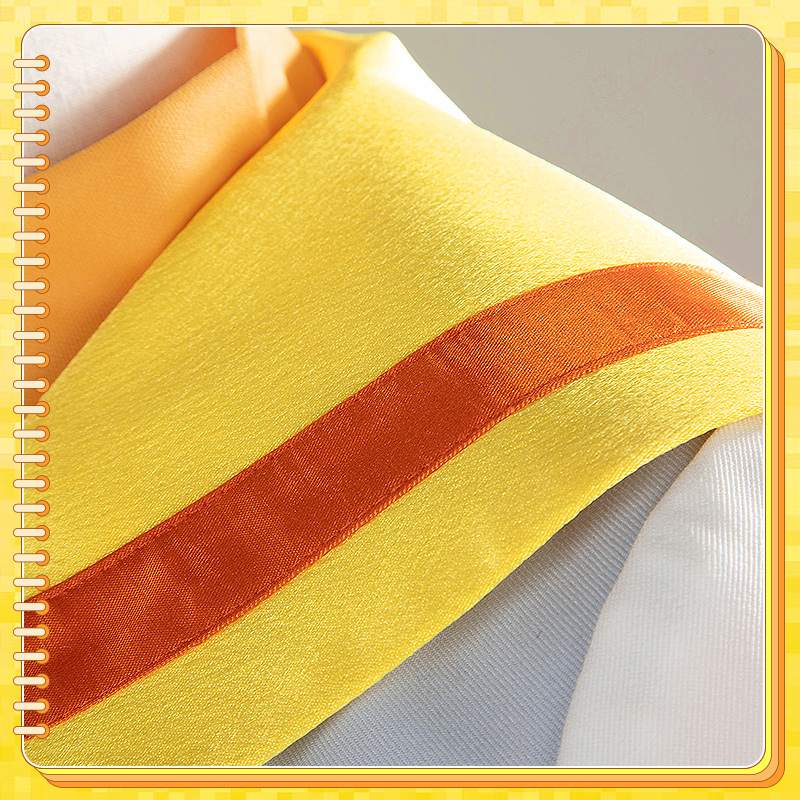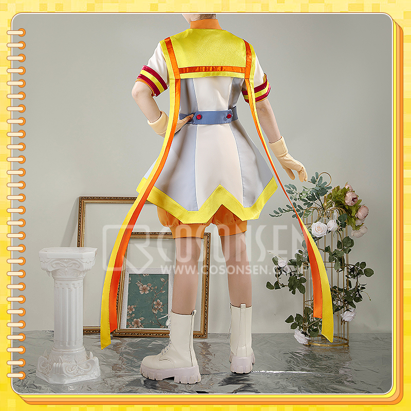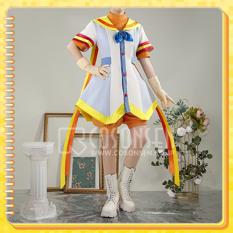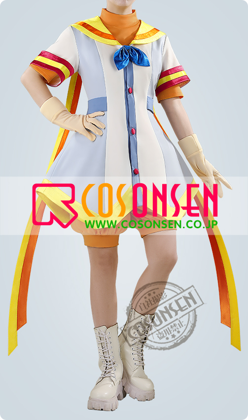 クールコットンとポリエステルで製作しています。クリーム色と淡い青色のセーラードレスには、黄色と赤のストライプがアクセントとして施されています。裾には長いリボンが特徴で、再現度が高く、細部にもこだわっています。