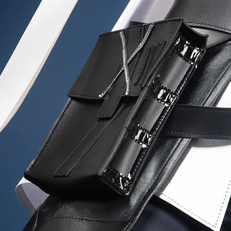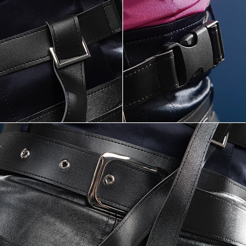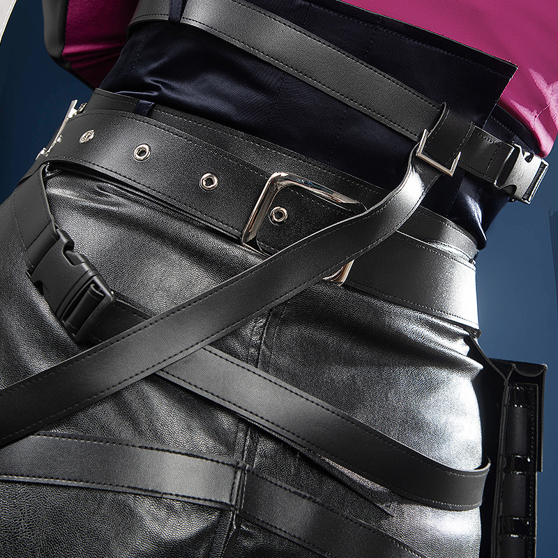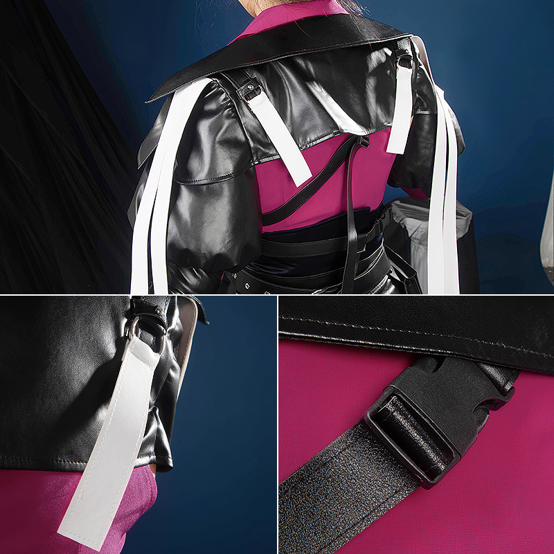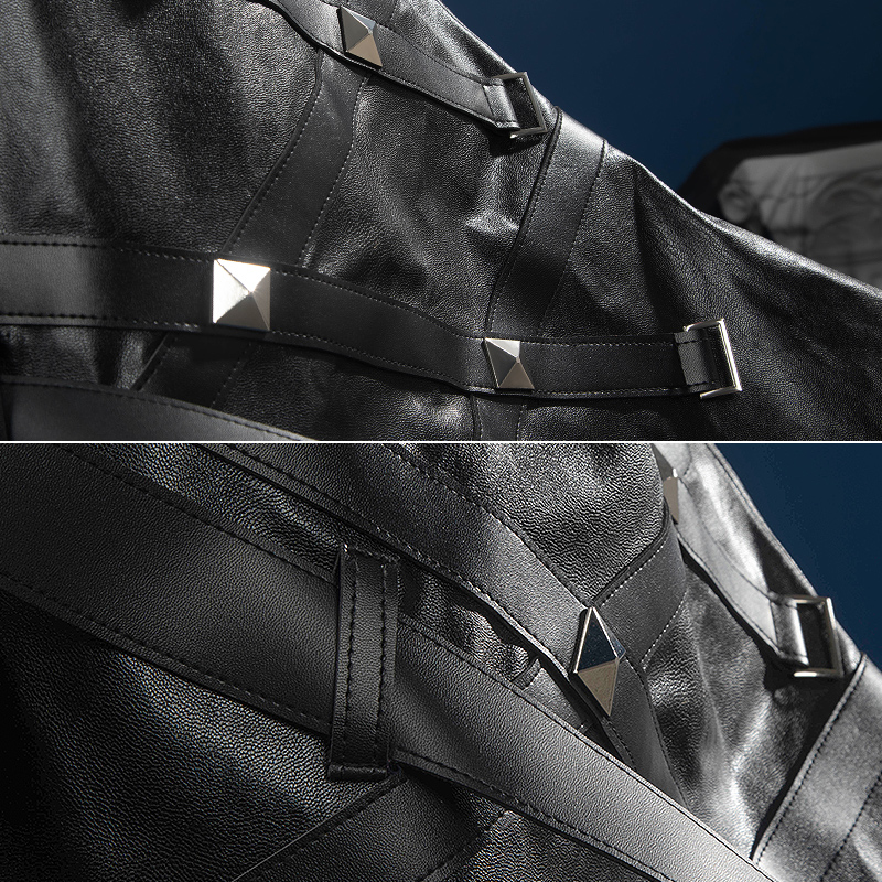 合皮で製作しています。ボリューム感たっぷりなマントは、滑らかな質感と高級感があります。一方には立体的なポケットが付いていて、実用性とファッション性を兼ね備えています。また、皮の飾りが施されているため、再現性が非常に優れています。