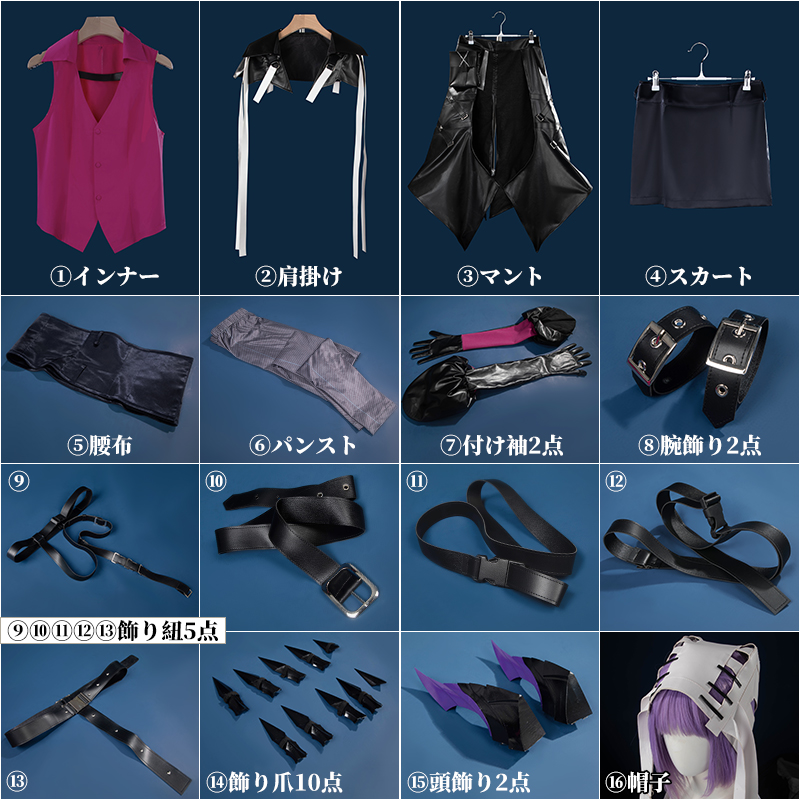帽子、マント、肩掛け、インナー、スカート、飾り物(頭飾り2点、腰布、飾り爪10点、付け袖2点、腕飾り2点、飾り紐5点、パンスト)