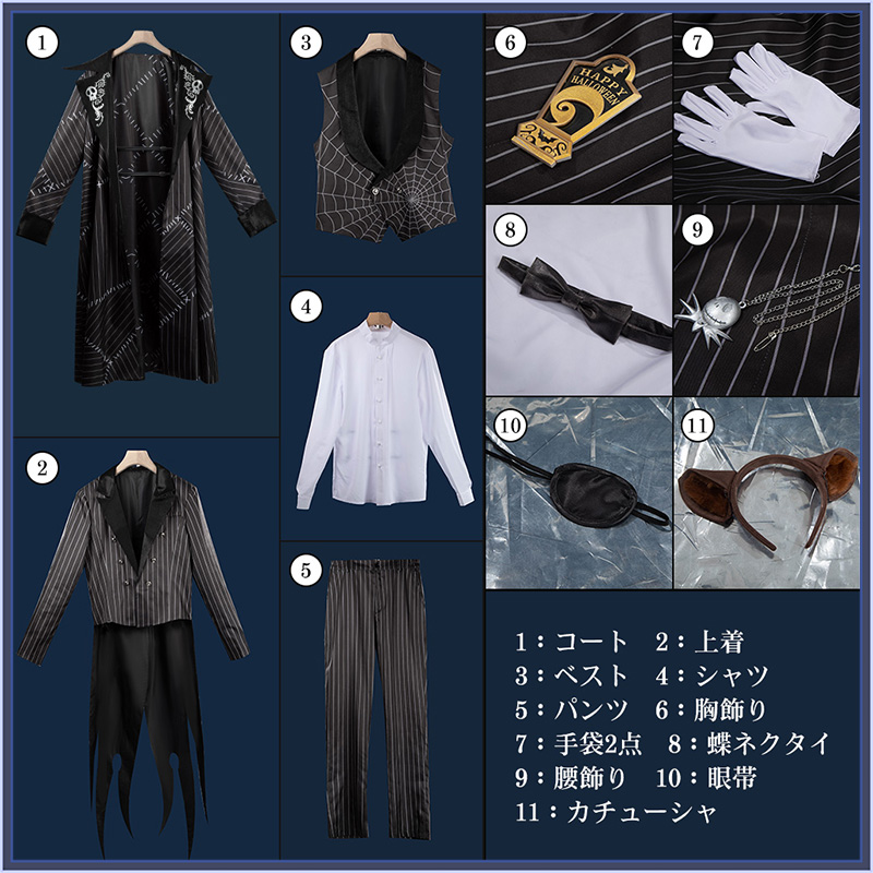 コート、上着、ベスト、シャツ、パンツ、飾り物(眼帯、カチューシャ、蝶ネクタイ、胸飾り、腰飾り、手袋2点)