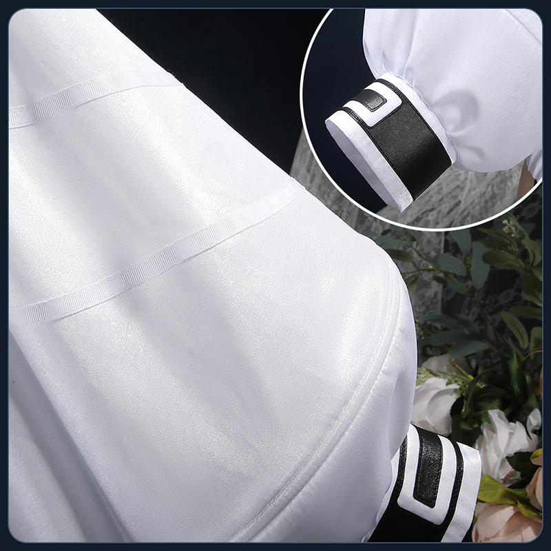 光沢布で製作しています。白を基調としたフレアスリーブデザインの上着は、肩から袖口に向かって広がり、ゆったりとしたシルエットで着心地とスタイルを両立しています。