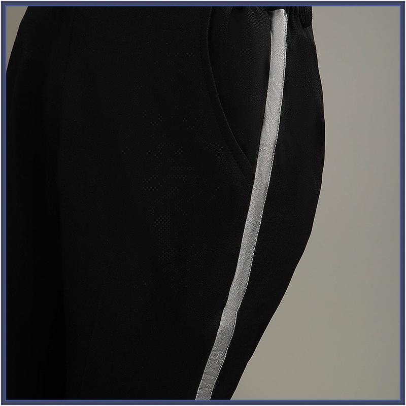 T/R生地で製作しています。ストレートな黒いパンツです。脚長効果を発揮しています。両サイドの銀のラインがシンプルなデザインに差をつけます。