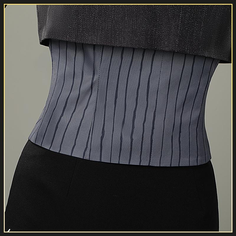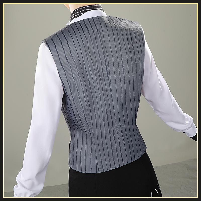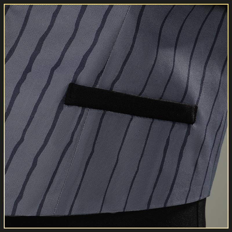 ポリエステルギャバが製作しています。灰色の縦縞柄がシックな雰囲気を醸し出しています。Vネックのカットで首元がスッキリと見え、縦一列に並ぶブラックのボタンがデザインのポイントとなっています。両側のポケットにはブラックの装飾が施されます。