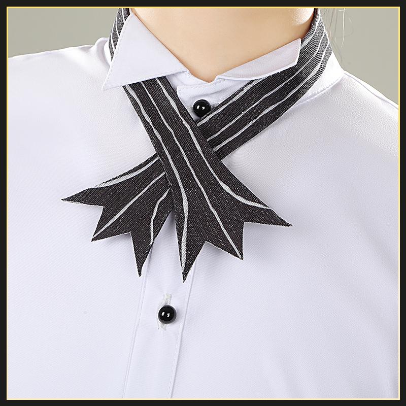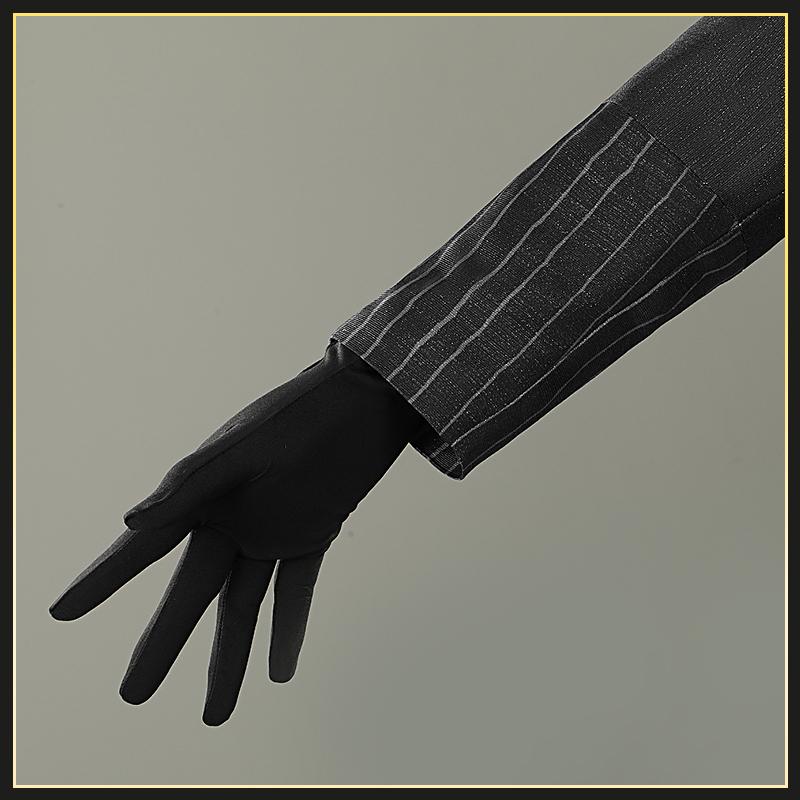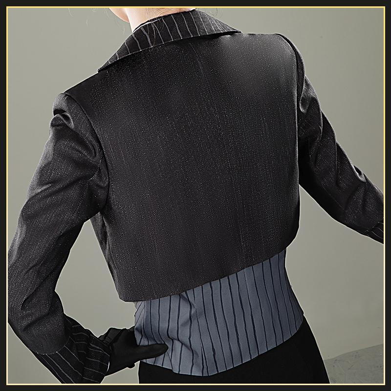 銀繊維入り生地で製作しています。クラウン型に襟元に白いストライプ模様が大胆に施され、シャープで個性的な印象を与えます。ダブルブレストの構成には黒く輝くボタンを採用し、ディテールへのこだわりが光ります。