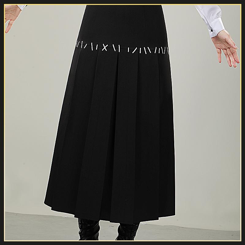 TRサージで製作しています。地面に届くロング丈のデザインです、身頃にはプルーツが設けられ、歩くたびに美しく揺れます。腰周りには白い不規則な縦縞柄がアクセントとして施され、シンプルながらも細やかなディテールが魅力です。