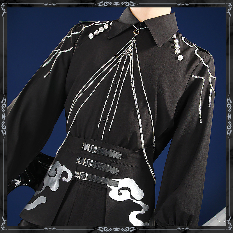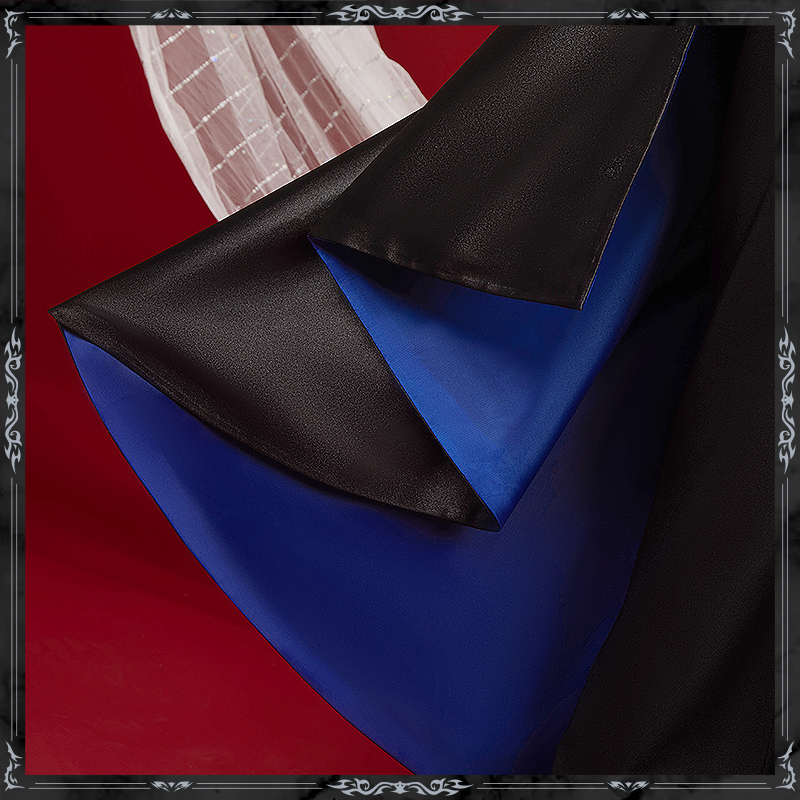 シャツ生地とサテンで製作しています。鮮やかな青色の生地が視覚的に強烈なインパクトを与えます。上部には白い雲のような模様が優雅に描かれ、背中側は長く流れるデザインで、前面は短くカットされており、動きやすさと洗練されたスタイリッシュさを兼ね備えています。