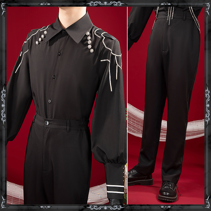 ポリエステルギャバで製作しています。黒を基調とし、真っ直ぐなシルエットで、脚長効果を発揮しています。