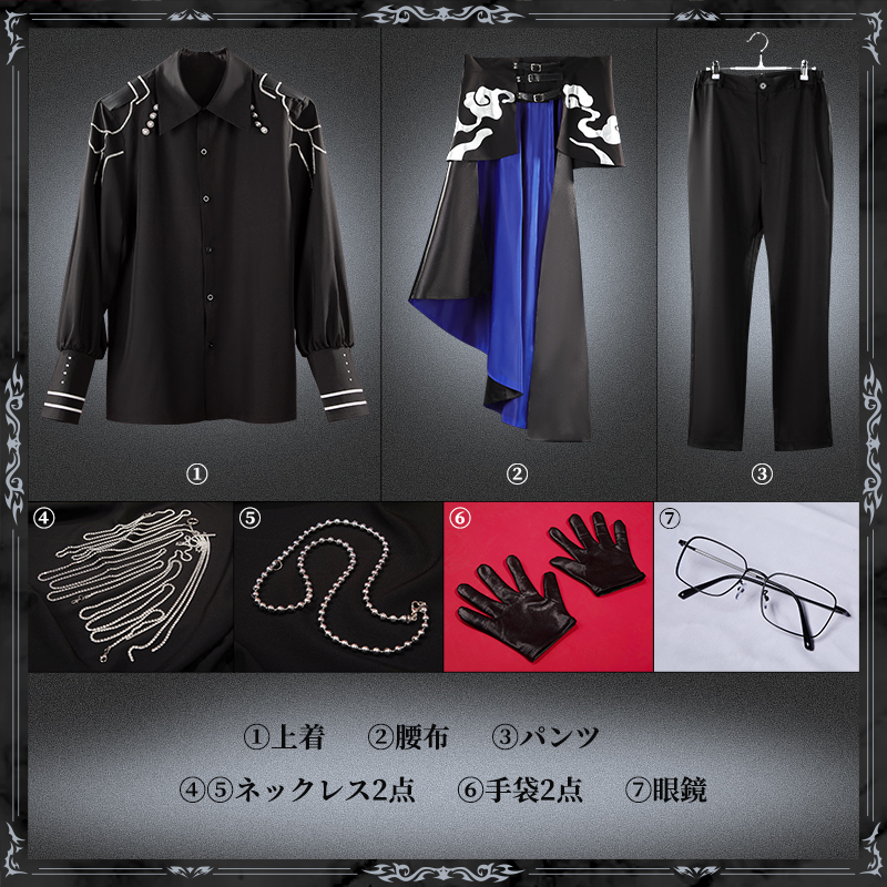 上着、腰布、パンツ、飾り物(ネックレス2点、手袋2点、眼鏡)