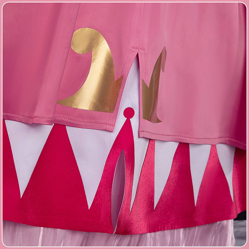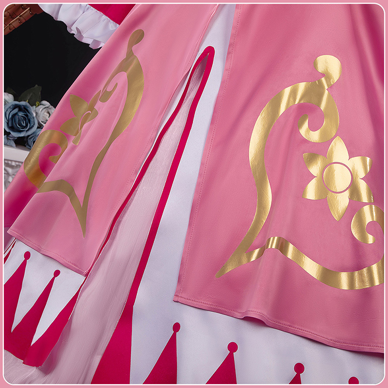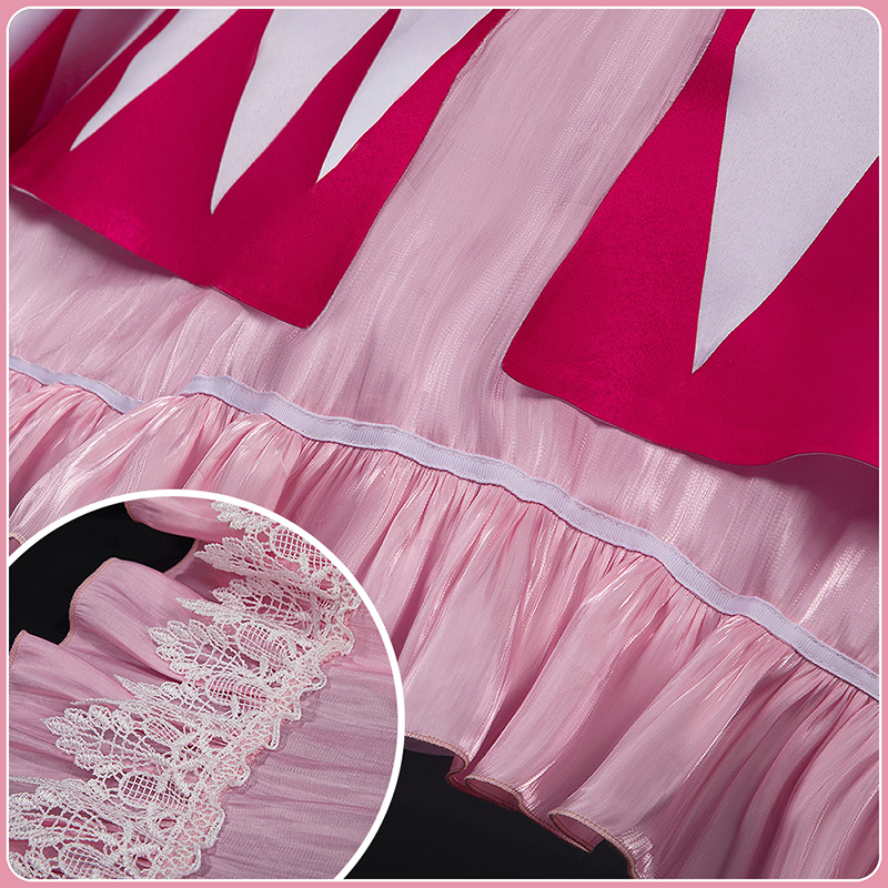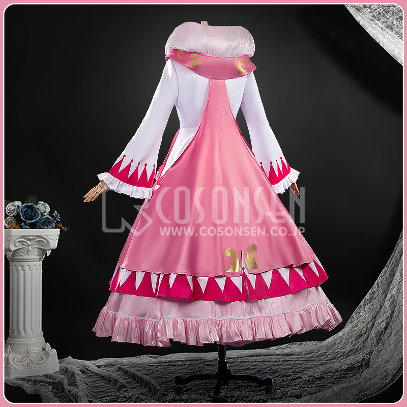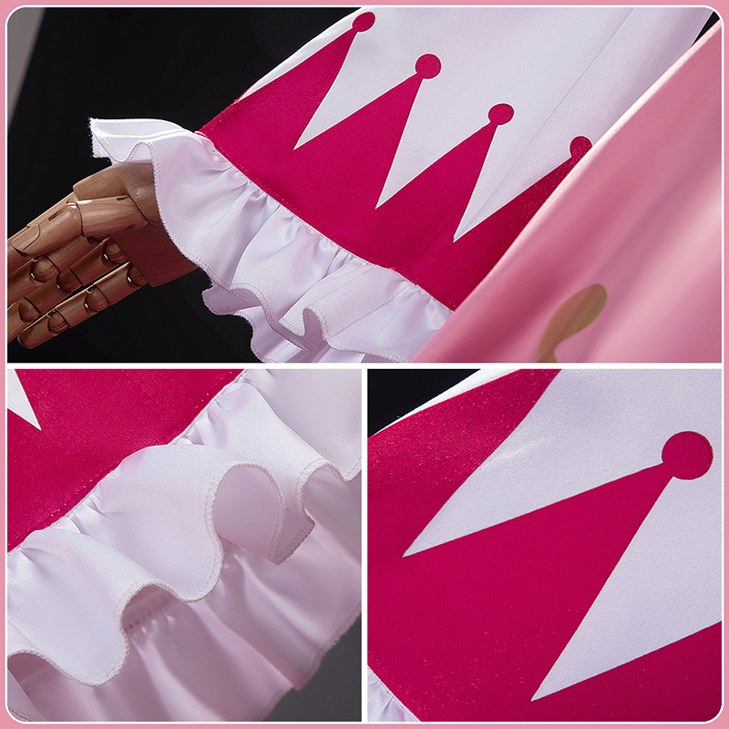 ウォールサテンとベルベット生地で製作しています。袖口とスカートの裾に王冠の模様が施され、フリルで女性らしさを演出。可愛らしくおしゃれなデザインです。
