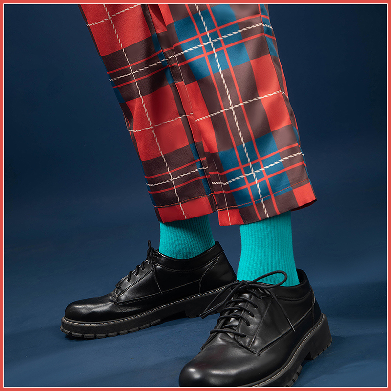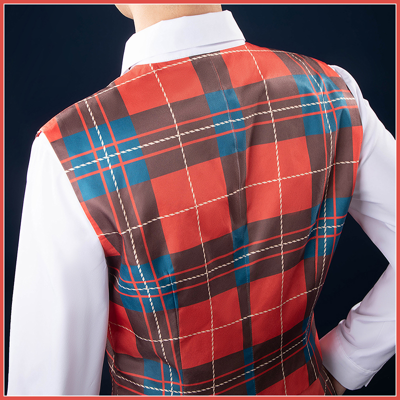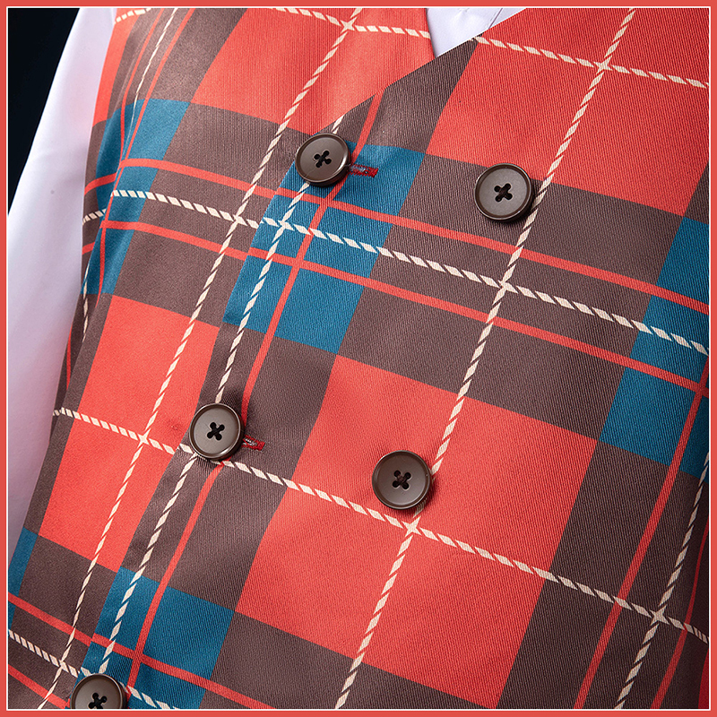 ポリエステルギャバで製作しています。チェック柄のベストは、鮮やかな色合いで活気を感じさせます。