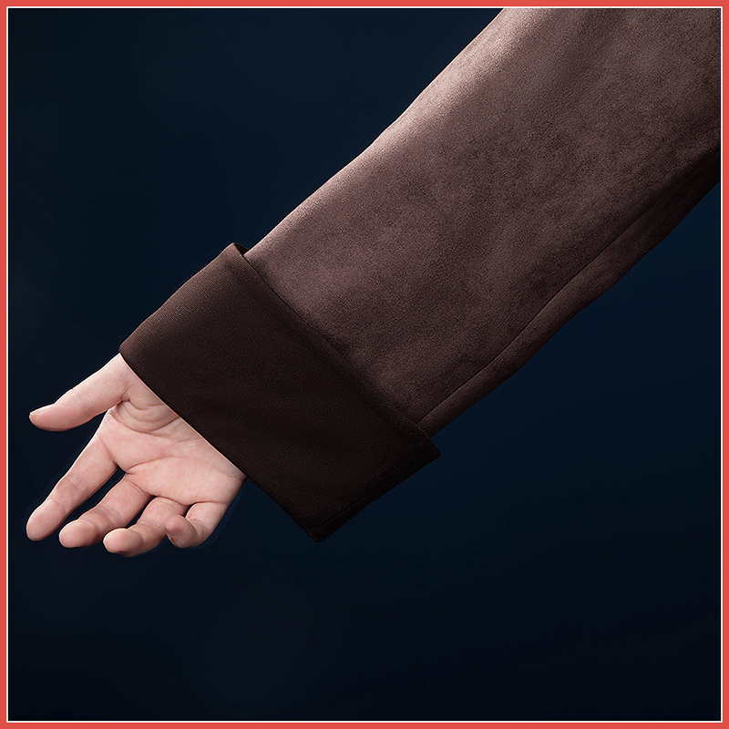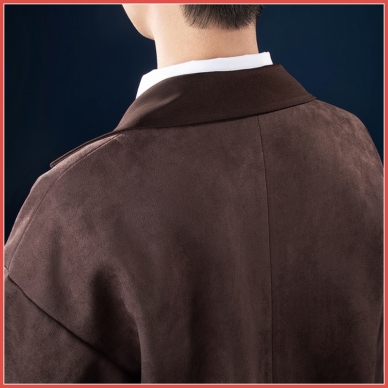 スエード生地で製作しています。落ち着いた色調で知性を引き立てています。黒の襟と袖口が絶妙なアクセントとなり、シンプルでありながらも洗練されたスタイルを演出します。
