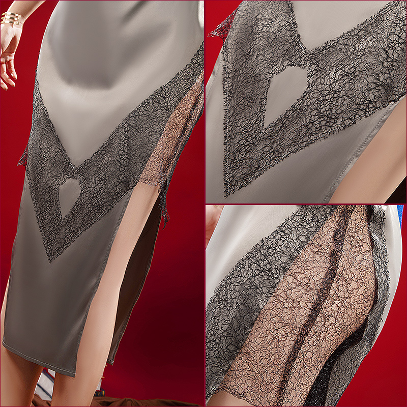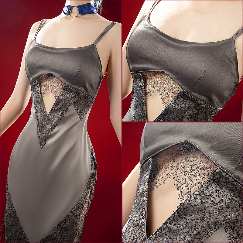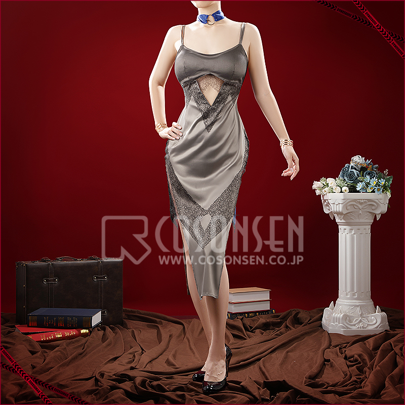 ダッチェスで製作しています。光沢感のある生地にレースが施されており、華やかさと女性らしさを引き立てる一着です。
