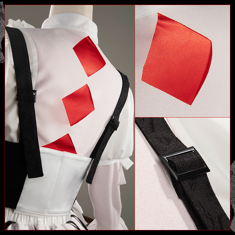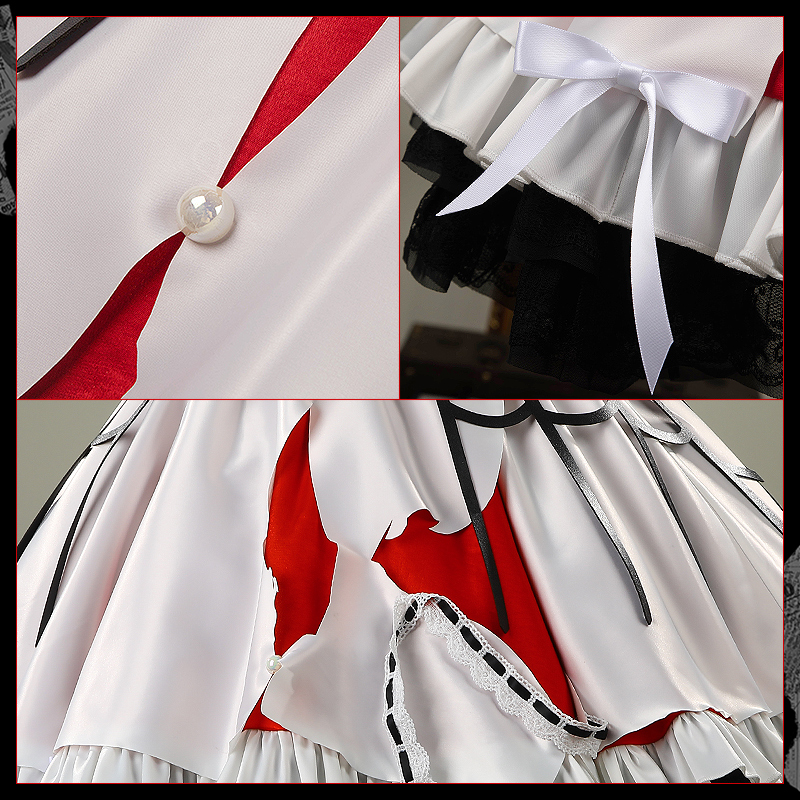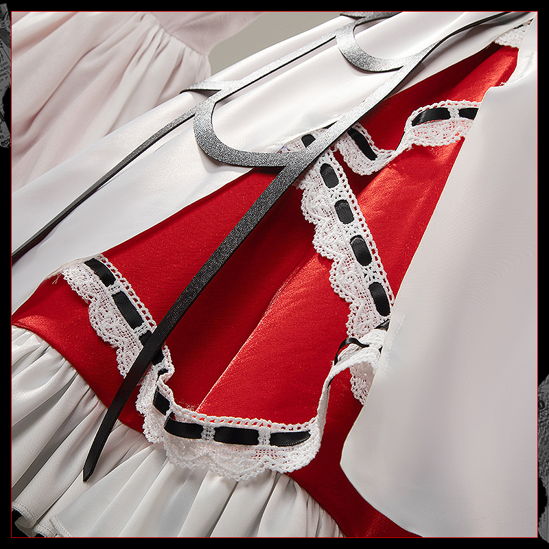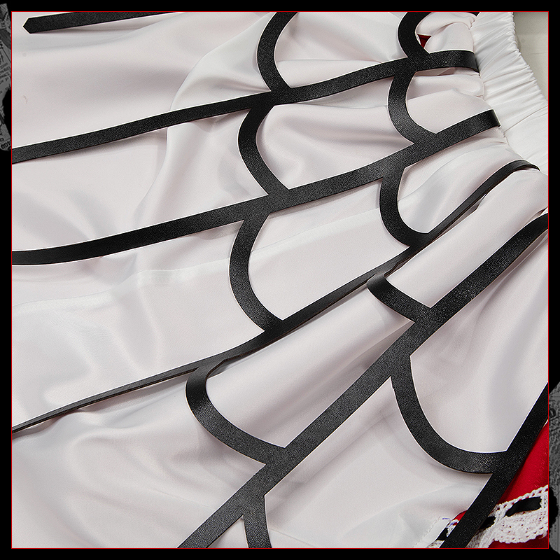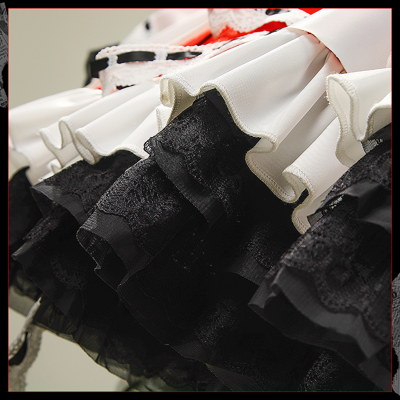 ダッチェスと光沢布で製作しています。全体がダークロリータのデザインで、スカート部分は複数のプリーツが施され、オリジナルの再現度が高く、細部にこだわった精巧さと神秘的な雰囲気が漂っています。