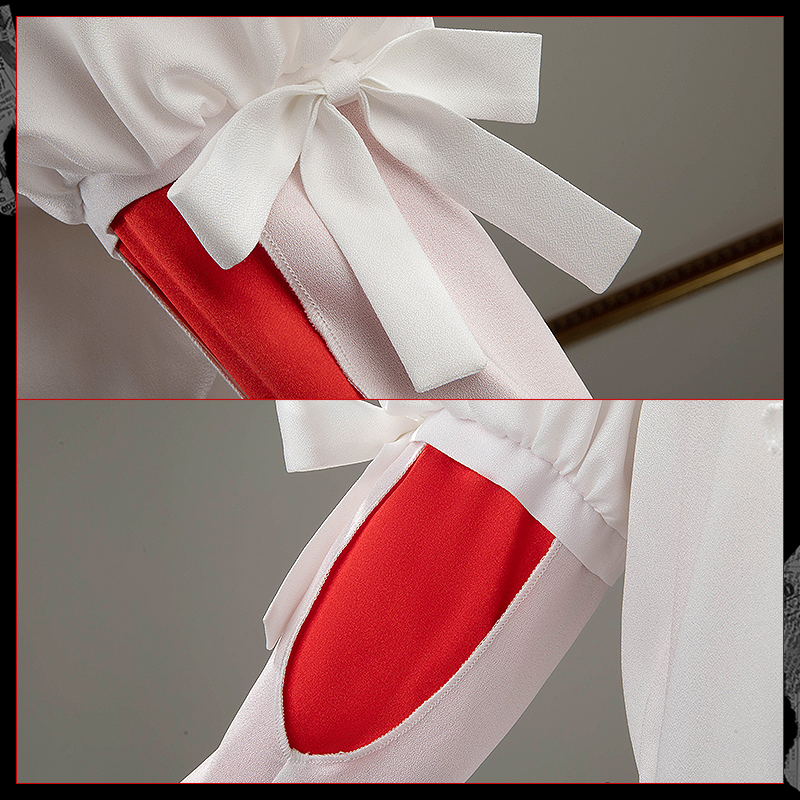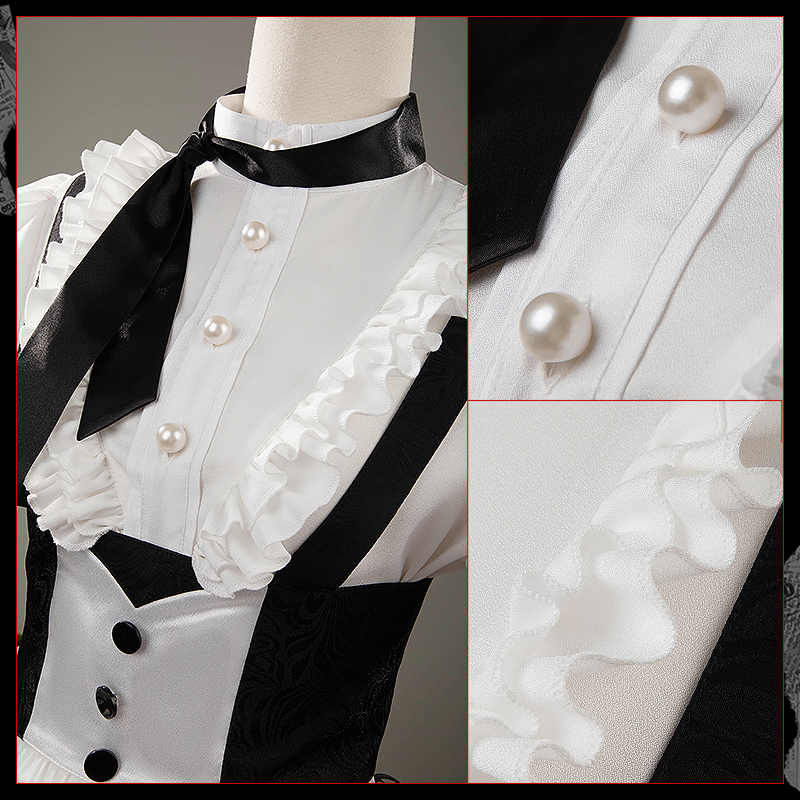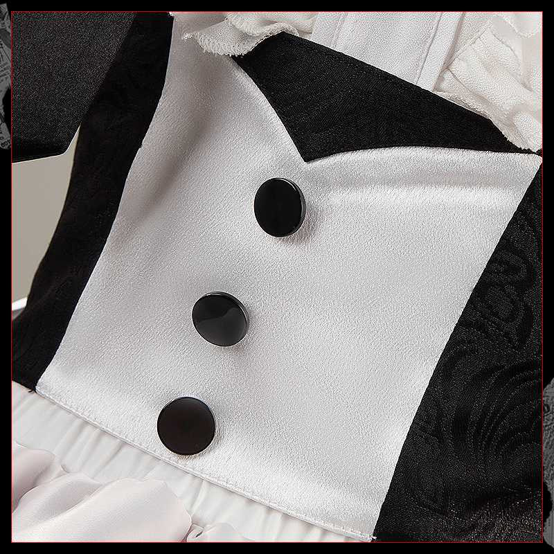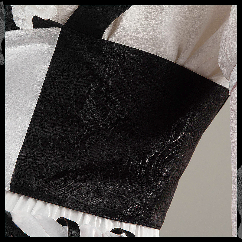 梨地ジョーゼットで製作しています。清楚な白色を基調とした上着に精巧なパールボタンをあしらい、ふんわりとした袖口には黒のレースが施されており、ロマンチックさとモダンな要素が見事に融合した個性的でエレガントなデザインです。