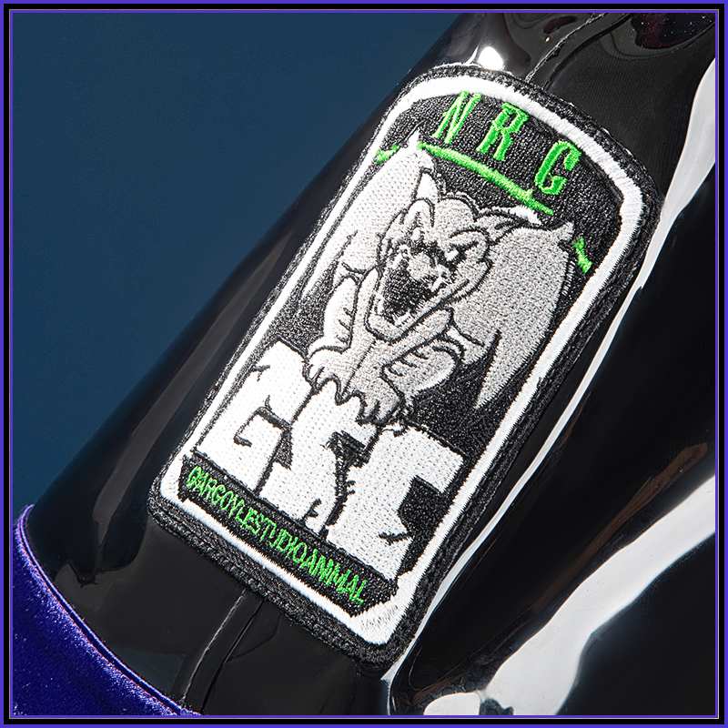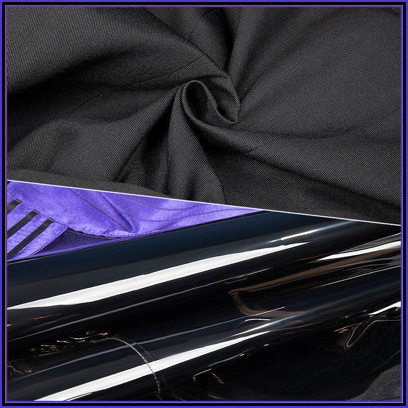 主にポリエステルとTPU生地製作しています。光沢のある黒を基調に、紫のアクセントが視覚的なコントラストを鮮やかに演出します。