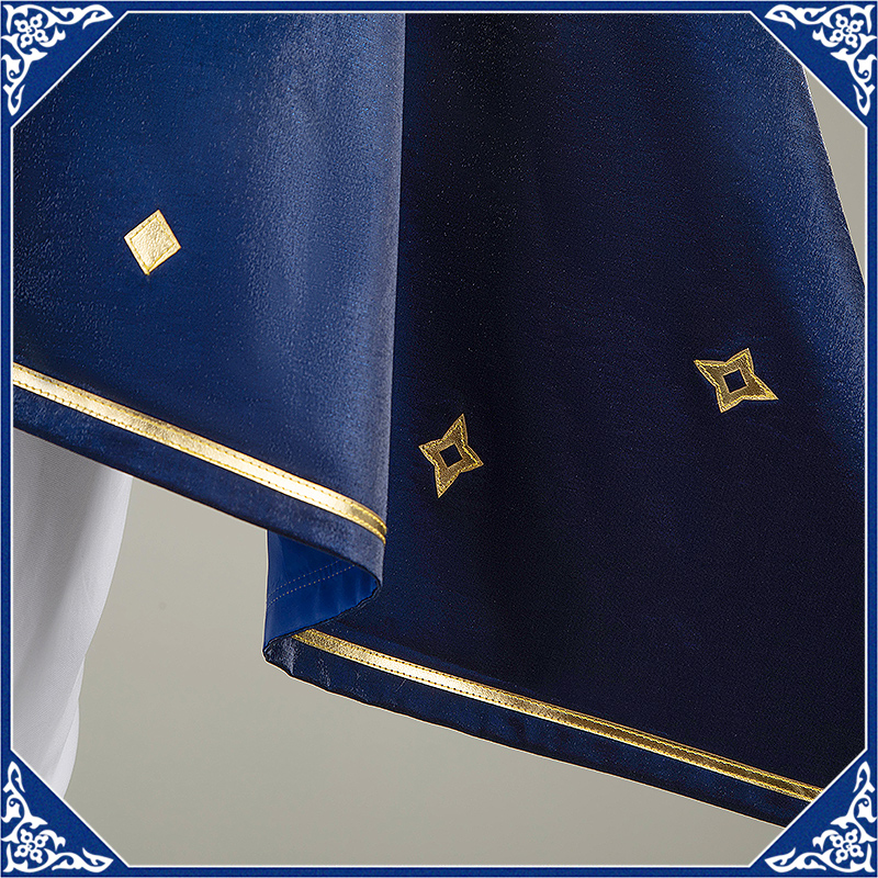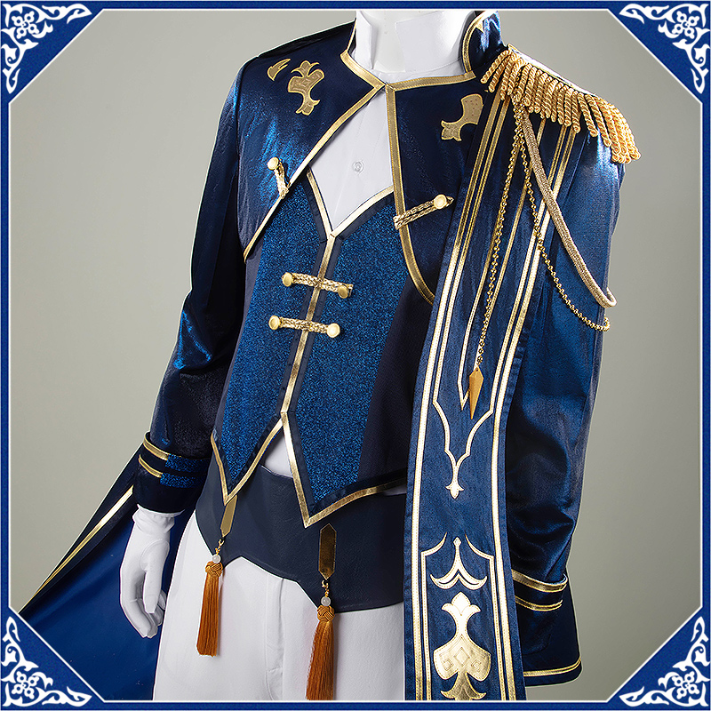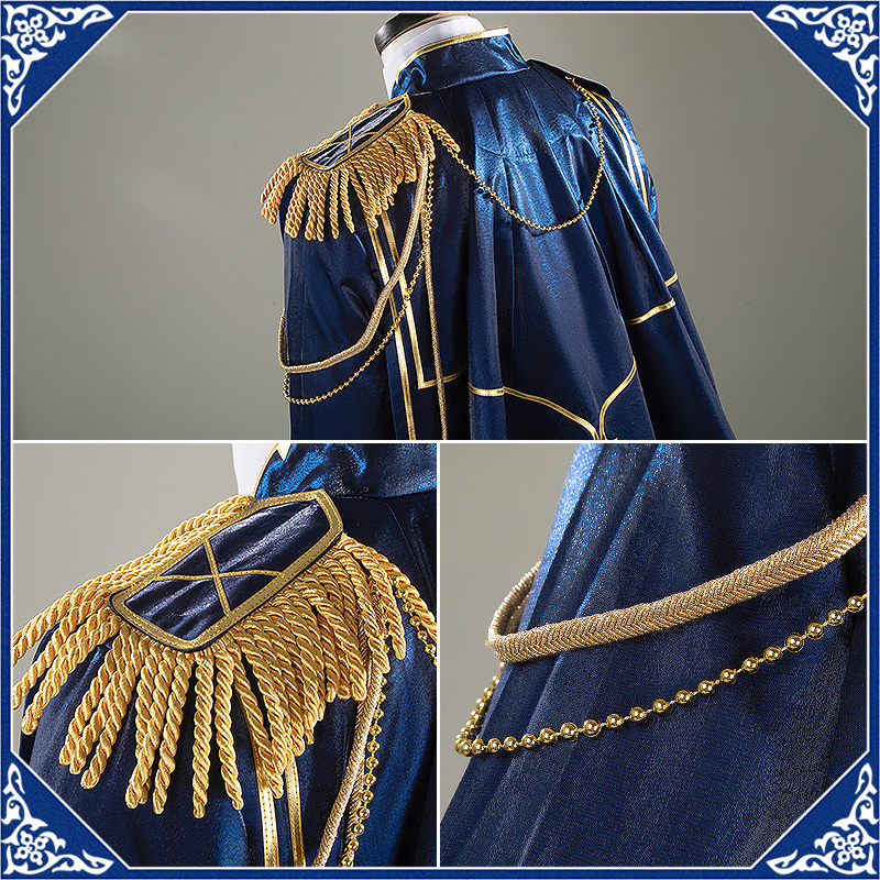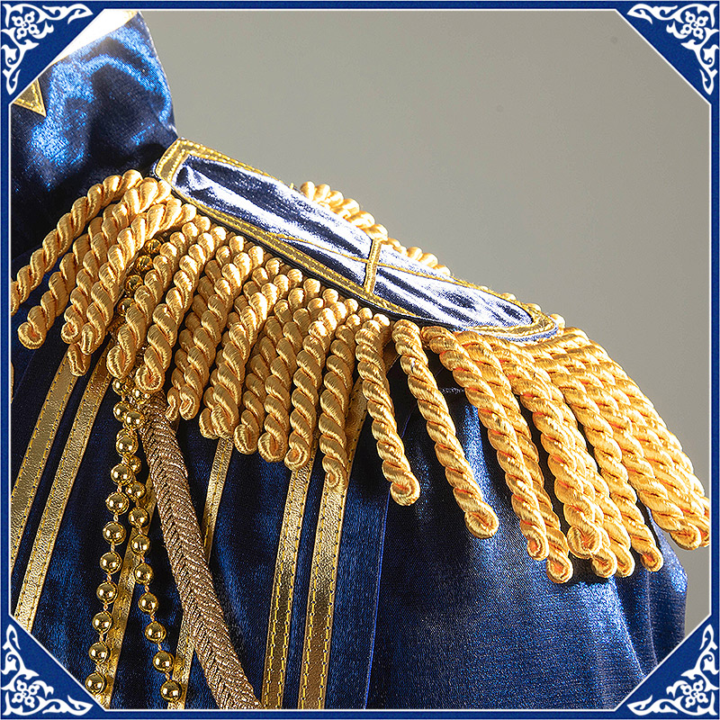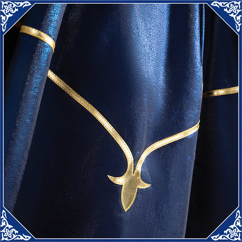 光沢布で製作しています。深みのあるブルーを基調に、ゴールドの縁取りが鮮やかに映えるこの衣装は、舞台上で際立つ存在感を演出します。