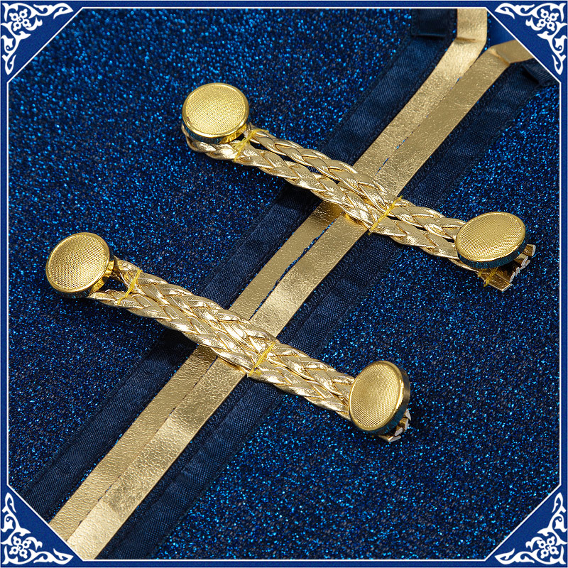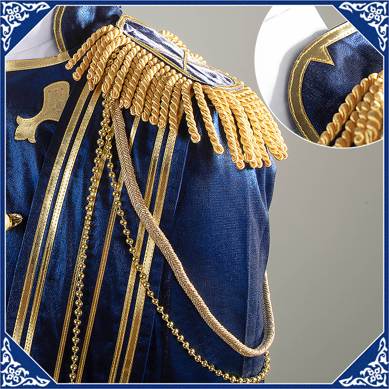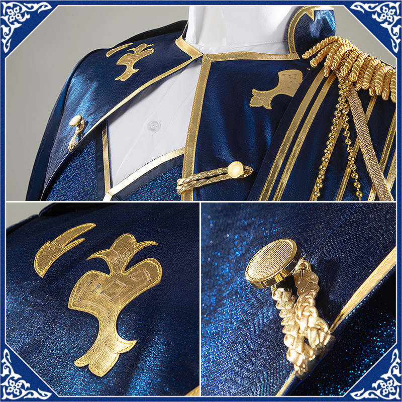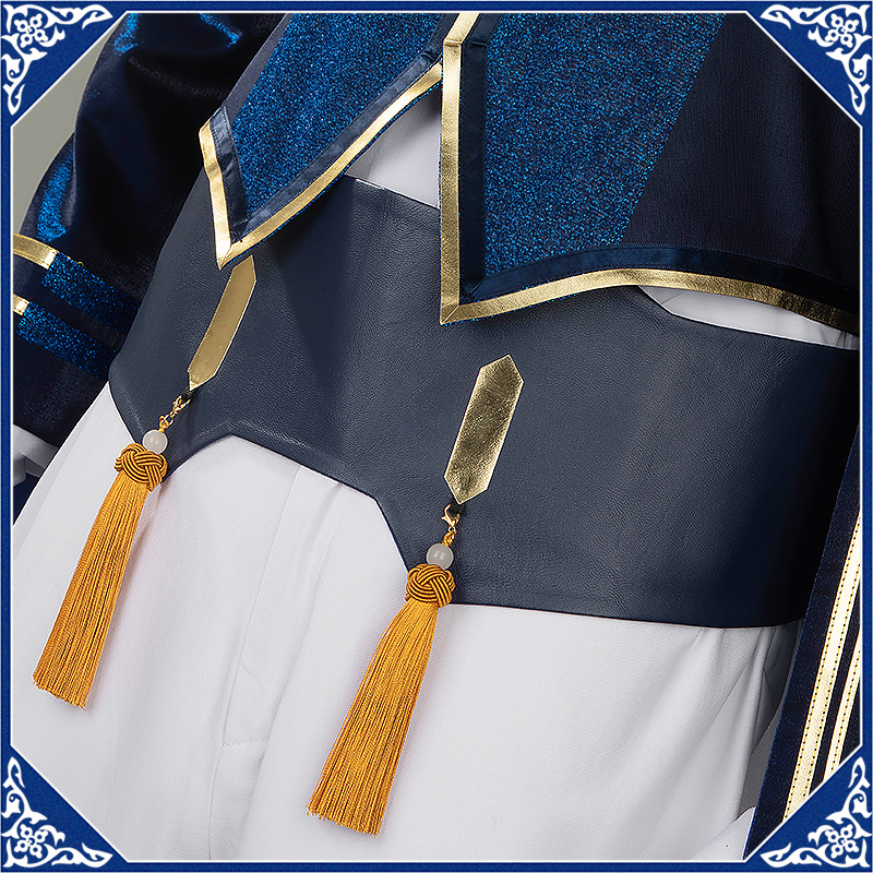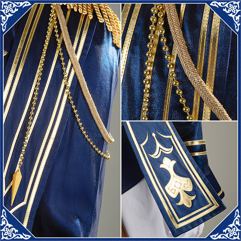 光沢布で製作しています。深みのあるブルーを基調に、ゴールドの縁取りが鮮やかに映えるこの衣装は、舞台上で際立つ存在感を演出します。